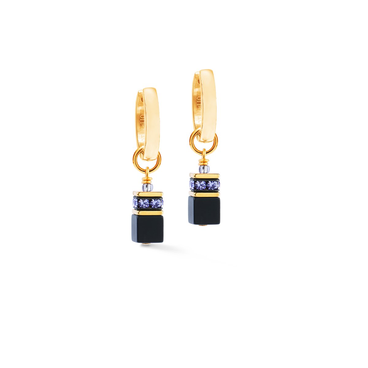 These convertible hoop earrings offer two styles in one: wear them with the removable pendant — consisting of an onyx cube and colour-coordinated crystals — or as classic, gold-coloured hoop earrings on their own. Ideal for all those who like to vary and pay attention to fine details.