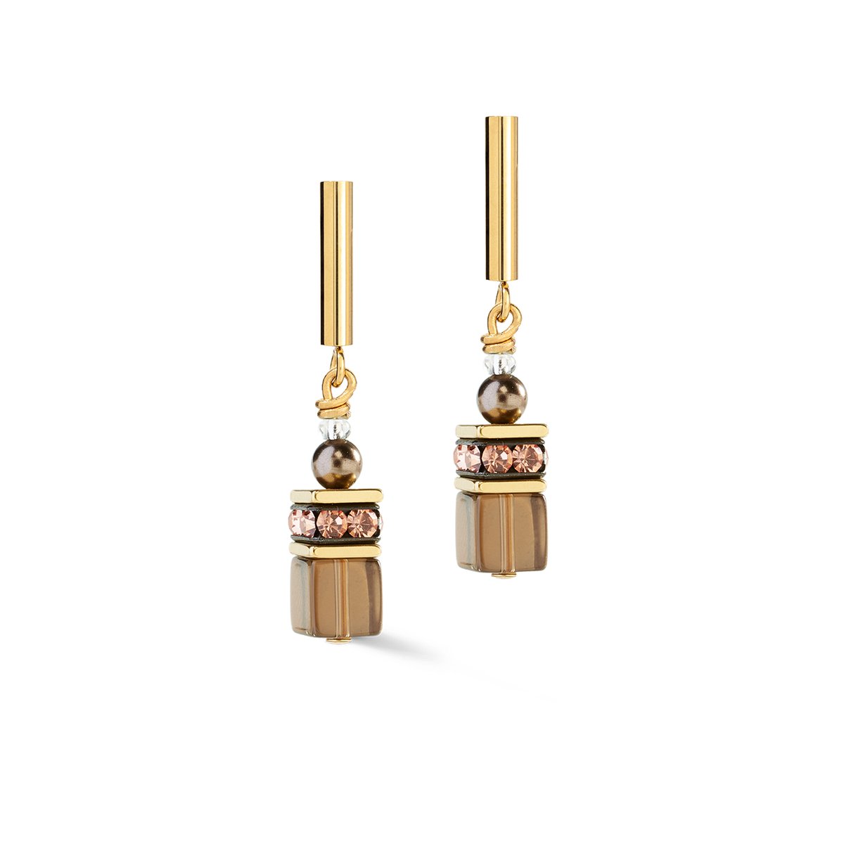 The GeoCUBE® earrings in Mocha Mousse impress with an elegant composition of shimmering crystal pearl, a cube of smoky quartz and rose-coloured crystal elements. The slim, vertical shape has a modern yet timeless look. The harmonious interplay of brown, rose and gold makes these earrings a stylish accent — perfect on their own or as a complement to a necklace and bracelet.