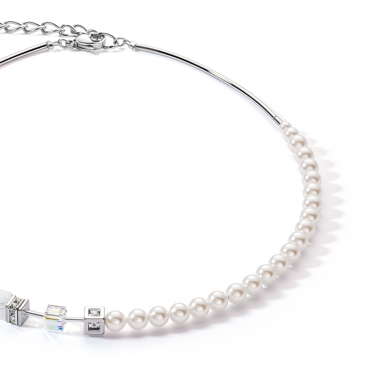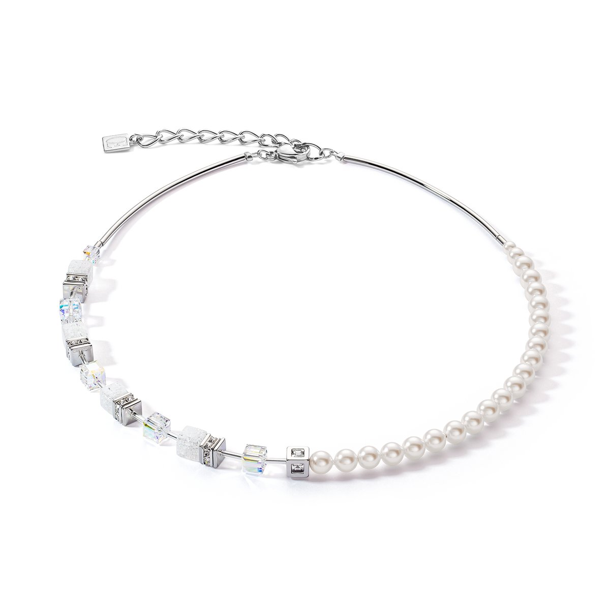 GeoCUBE® Fusion Pearls necklace a perfectly coordinated dialogue between cubist clarity and romantic shimmering pearls. The cracked rock crystal gently breaks with strict lines and thus stands in harmonious contrast to the delicate pearls. For those who love the layered look, the GeoCUBE® design can be twinned with grounding howlite, thus optimally complementing the calming quality of the rock crystal. An ideal ensemble for the coming wedding season for brides and guests alike.