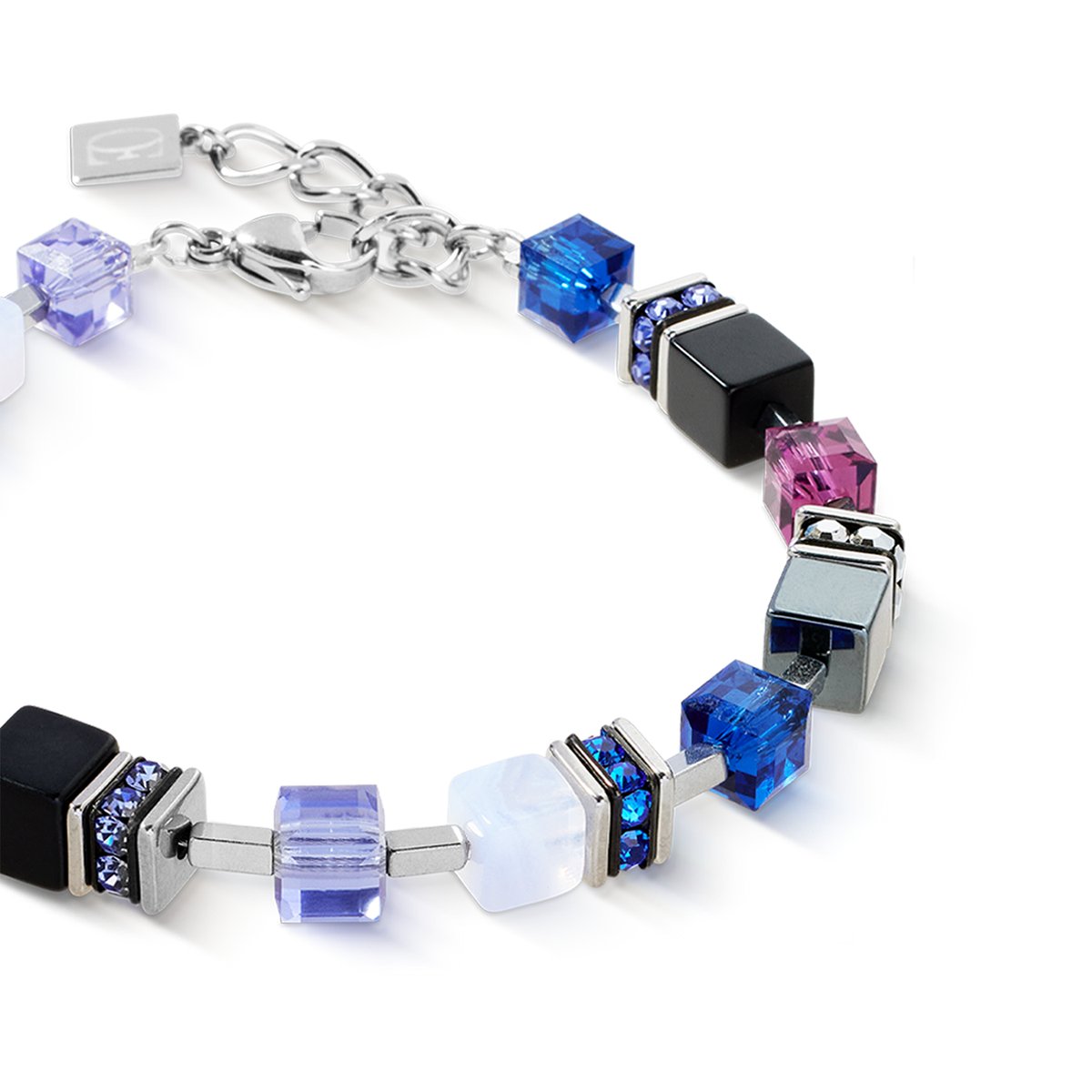 This bracelet impresses with powerful contrasts: Intense colours such as pink, blue and violet meet striking cube shapes in onyx, chalcedony and hematite. Silver-coloured stainless steel lends structure and lightness to the design. For all those who love colour and appreciate clear lines.