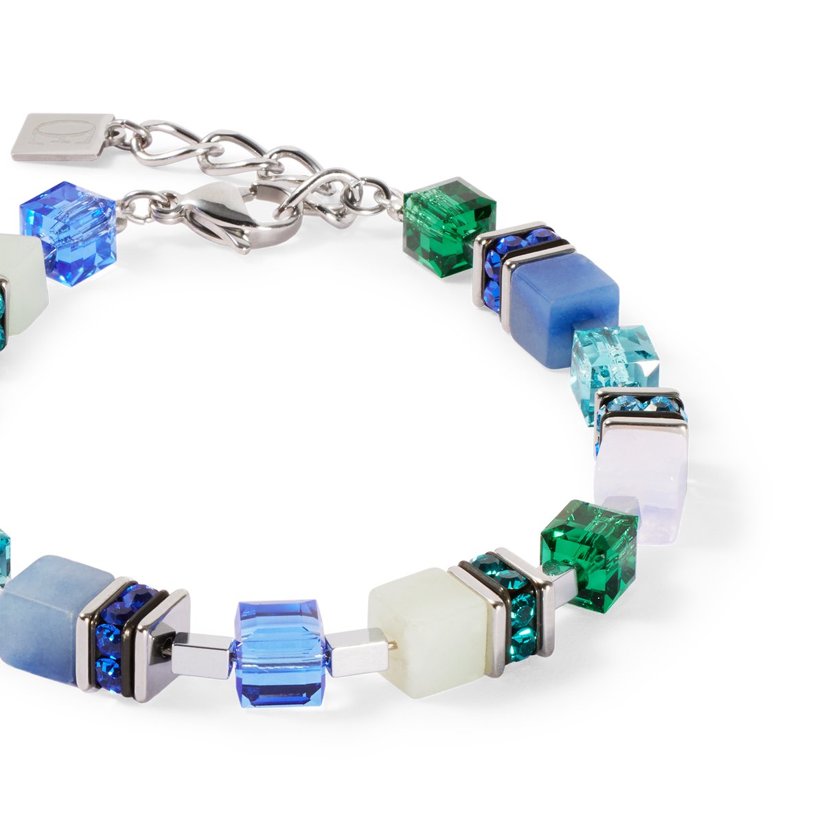 Like the gentle sound of the ocean — the GeoCUBE® Precious Statement bracelet silver-ocean combines cool blue tones, shiny Swarovski® crystals and precious gemstone cubes to create a harmonious, modern look. The silver-coloured details add a fresh, elegant touch — perfect for every day or special moments.