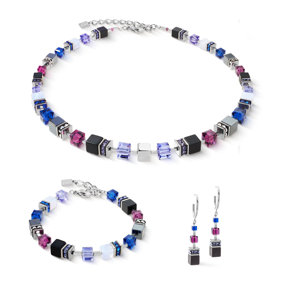 The GeoCUBE® Blue Moon hoop earrings set striking accents with geometric clarity. A black onyx cube forms the base of the pendant, complemented by cube elements in bright pink and vibrant blue. Silver-coloured stainless steel gives the design a modern frame. Expressive and versatile — perfect as a statement, worn solo or as a set.