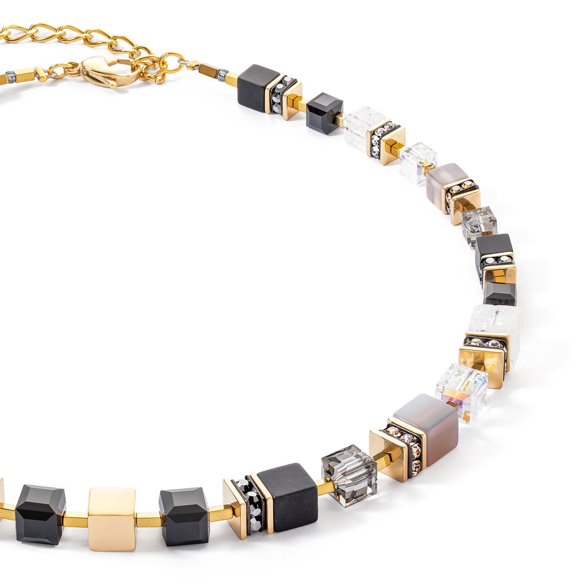 GeoCUBE® Precious statement necklace in gold and black: timeless sophistication in black For those who appreciate timeless elegance, the GeoCUBE® Precious statement necklace in gold and black is the perfect choice. The large GeoCUBES® made of precious gemstones and glittering Swarovski® crystals also take centre stage in this piece of jewellery. The arrangement of the cubes, which become smaller towards the back, ensures a harmonious design and optimum wearing comfort. The golden stainless steel cube in the centre of the chain creates a radiant accent and elegantly highlights the deep black of the gemstones. This necklace is a true classic that completes any festive outfit with a touch of luxurious sophistication.