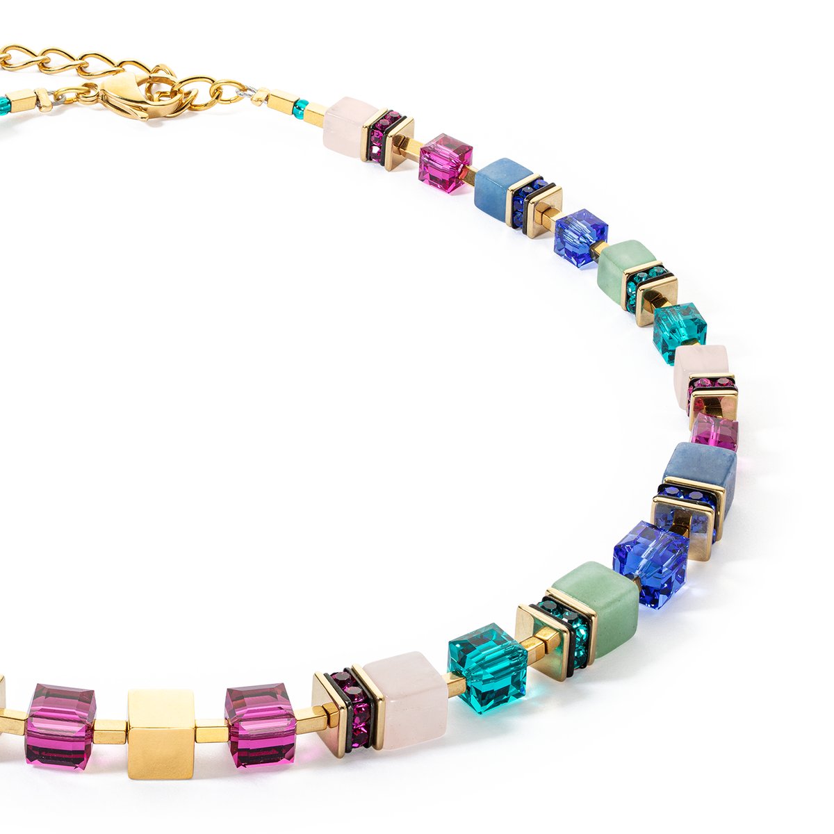 The gold and multicoloured GEOCUBE® Precious Statement necklace is a stunning piece of jewellery that makes a real statement. Large GEOCUBE® beads made from precious stones and Swarovski® crystals are what make this necklace so special. These elements are arranged so that they get smaller towards the back, which makes the necklace comfortable to wear. A golden stainless steel cube in the middle of the necklace forms the centrepiece of the design.