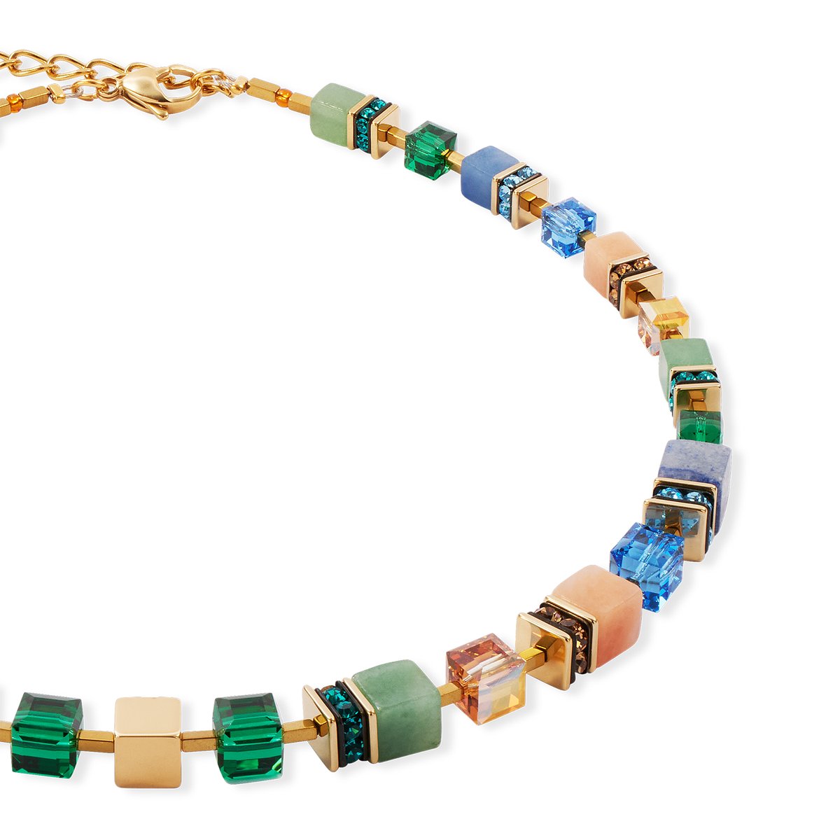 As radiant as spring — the GeoCUBE® Precious statement necklace gold-spring perfectly combines fresh colours and luxurious design. Glowing Swarovski® crystals, precious gemstone cubes and fine golden accents make an elegant statement, while the iconic GeoCUBE® elements create a modern, structured look. Perfect for anyone who combines style with ease.