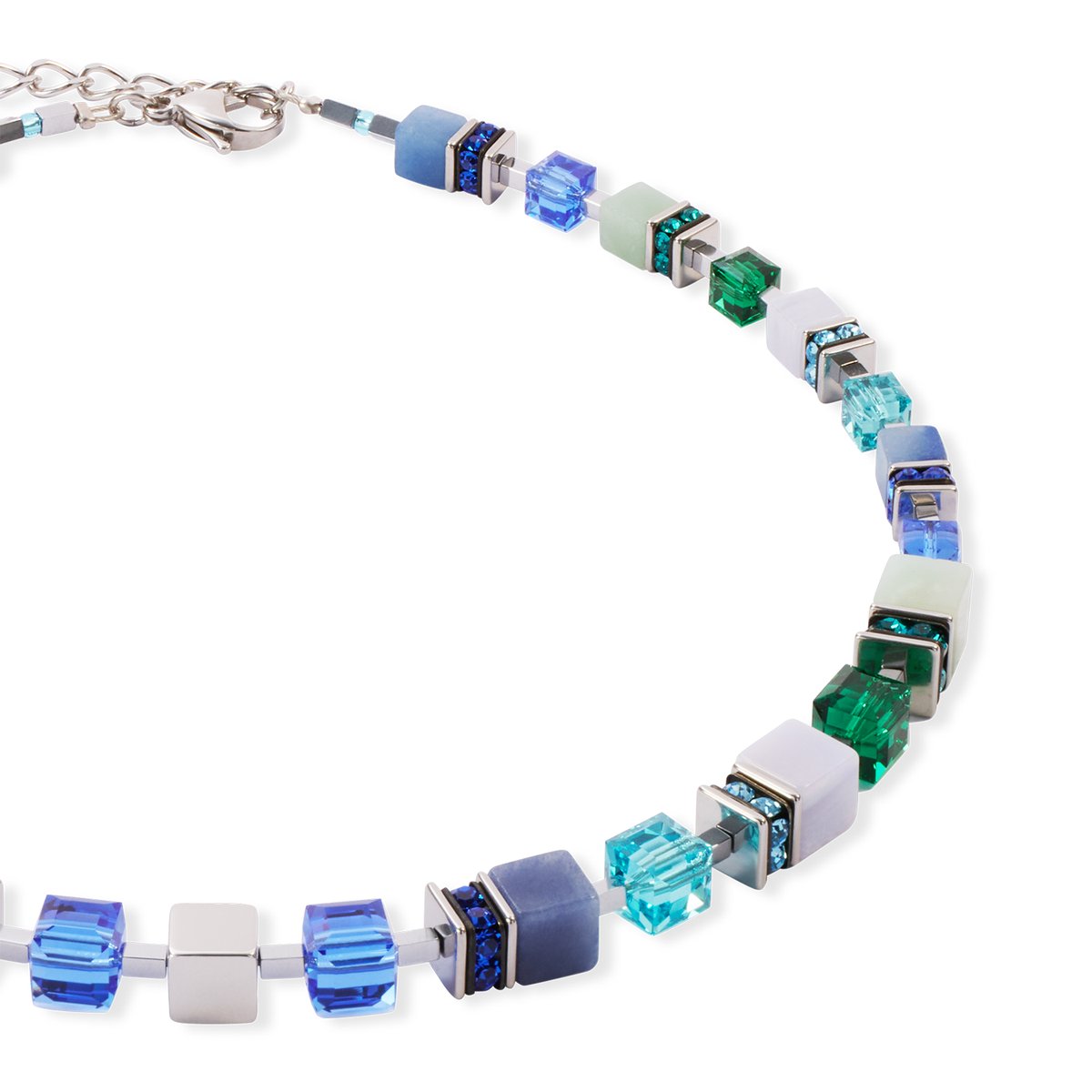 As deep as the sea, as radiant as the light on the waves — the GeoCUBE® Precious Statement Necklace silver-ocean combines cool blue tones, shimmering Swarovski® crystals and precious gemstone cubes to create a look that is both calming and mesmerising. The silver-coloured details add a modern touch, while the GeoCUBE® structure creates a harmonious, flowing design.