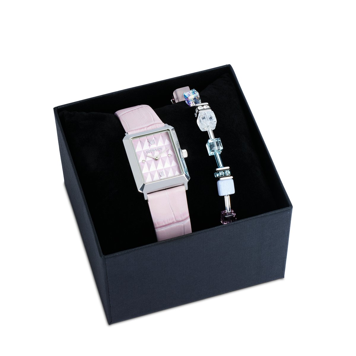 Feminine, modern, stylish — the Iconic Spikes Rosé Silver Gift Set combines the delicate Iconic Spikes watch in rosé silver with the elegant GeoCUBE® Iconic Precious bracelet in pink-lilac. A harmonious interplay of warm rose tones, sparkling crystals and high-quality stainless steel.