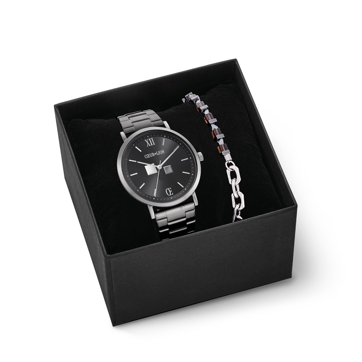 Gift Set Watch Round Statement Anthracite Sunray & bracelet Precious Fusion link chain brown-silver