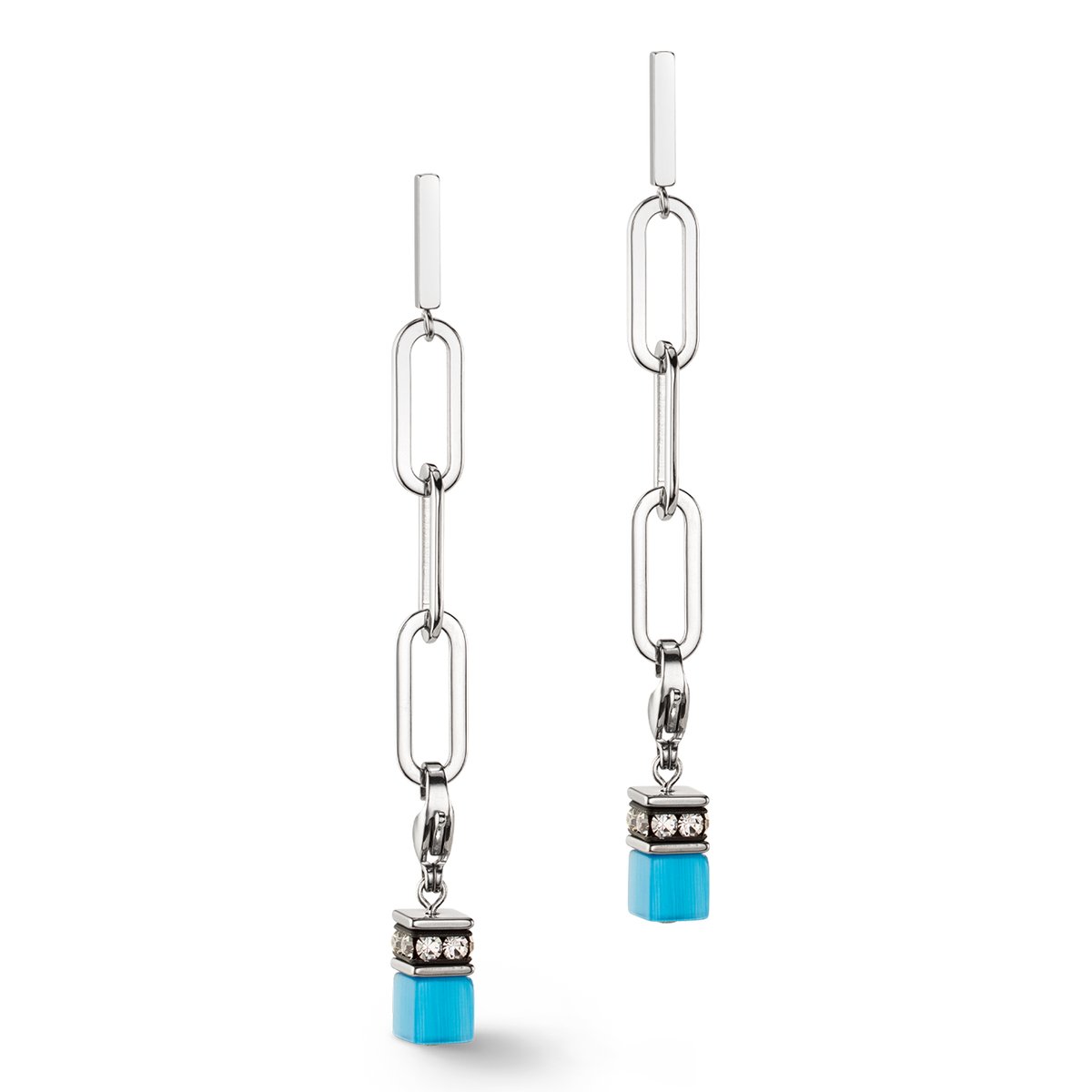 These multiwear paper-clip chain earrings in silver with Iconic Cube charms can be worn without charms or with coloured charms to match your outfit. All of the charms from the necklace, earrings and bracelet are interchangeable.