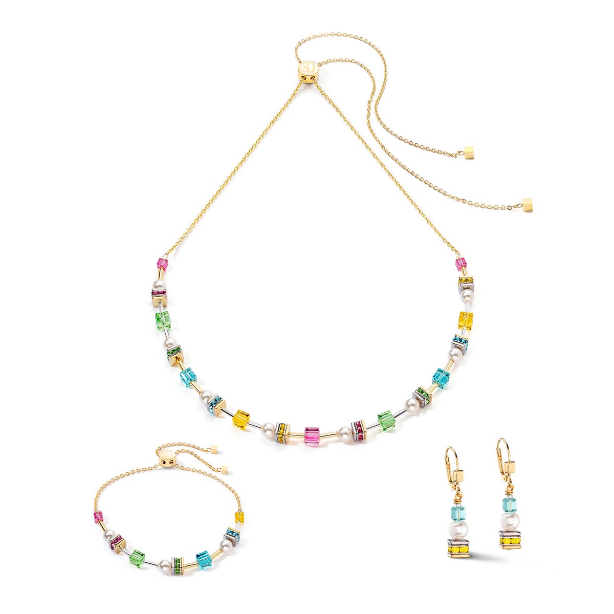 A breathtaking multicoloured creation combining fresh, springlike Joyful Color Cubes, vibrant Swarovski® crystals and sophisticated pearls. Light yet elegant. Complement this style with the Joyful Cubes & Pearls multicoloured short necklace and bracelet.
