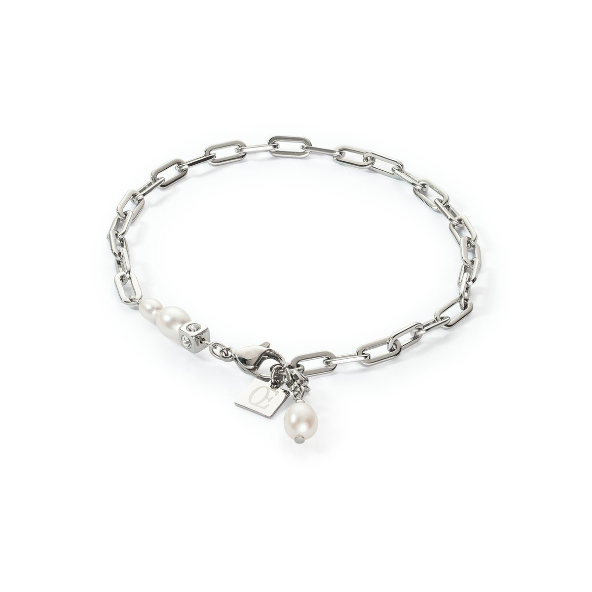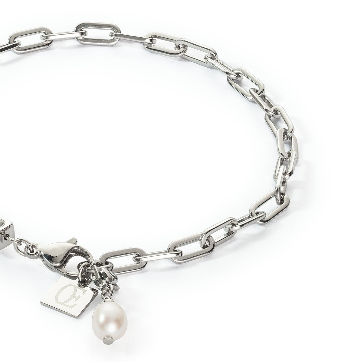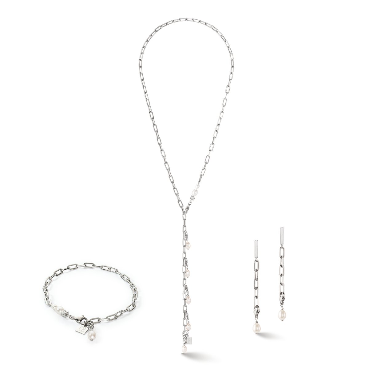 This modern chain bracelet in silver matches the necklace and earrings with its genuine freshwater pearls. It can be worn in all sorts of different ways, giving you the freedom to express yourself. What makes this design so special is that the pretty, detachable charms can be attached to any part of the link chain on the bracelet, necklace and earrings. This gives you endless mix-and-match possibilities with almost any piece of jewellery.