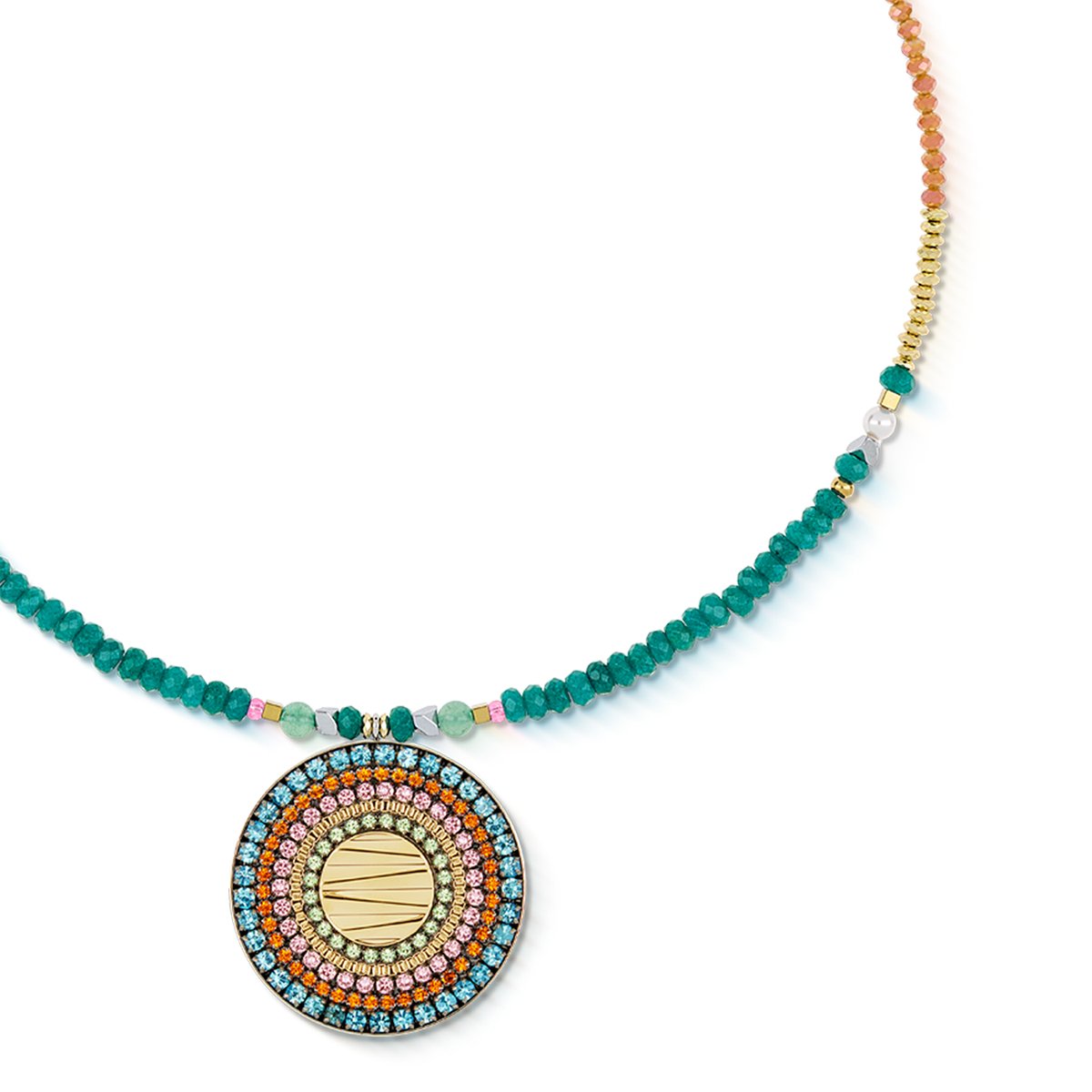 Boho meets structure: this expressive necklace combines colourful lightness with modern design. The central amulet made of gold-plated stainless steel is framed by finely cut Swarovski® crystals — a textured eye-catcher with depth. The necklace itself is characterised by the combination of natural materials such as green aventurine, coloured jade and shimmering Crystal Pearls by Swarovski®. A powerful statement for anyone looking for colour and clarity at the same time. The necklace looks particularly harmonious in combination with the structured pieces of jewellery from the Essentials Wave Collection.