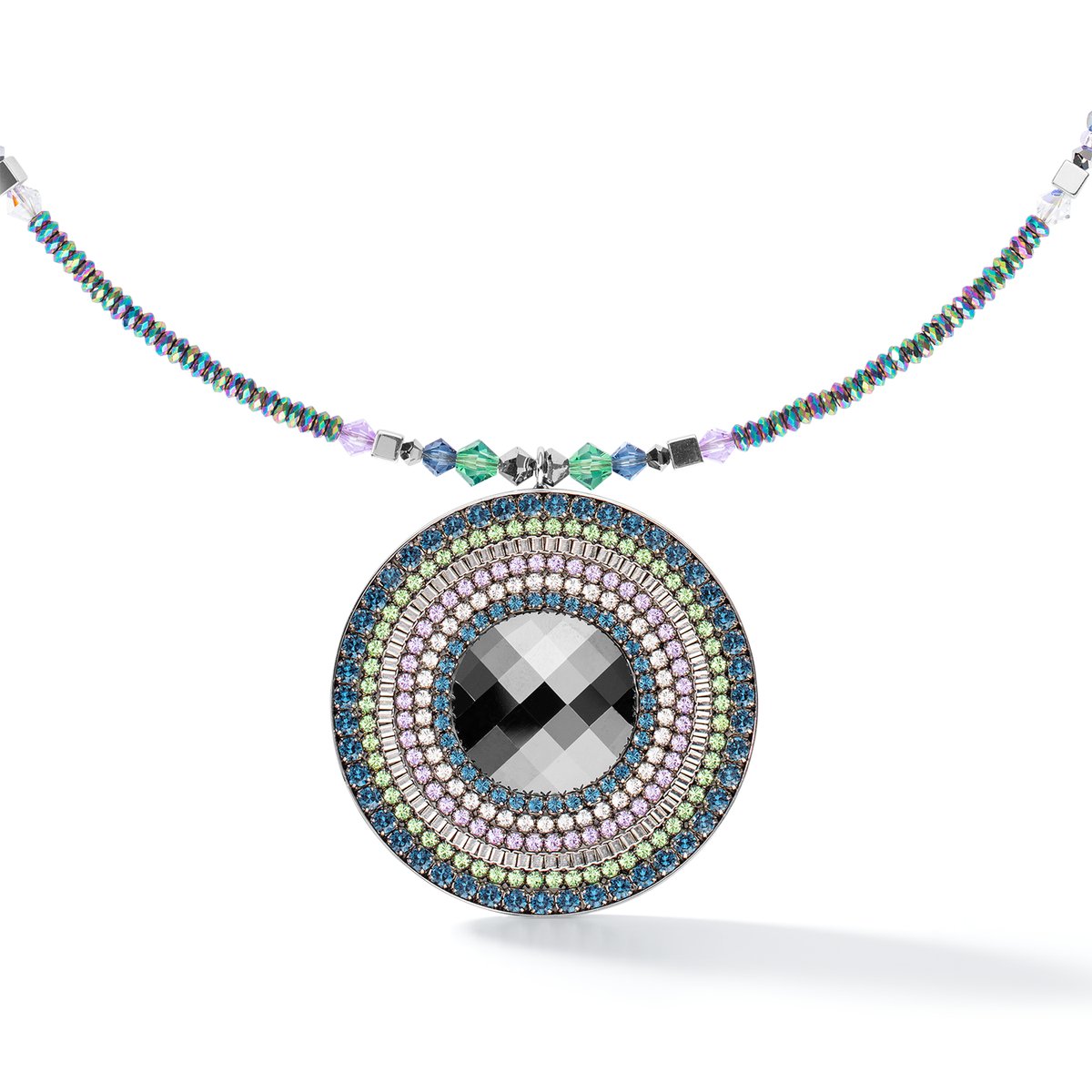 Inspired by mystical interplays of colour, this sparkling pendant will add a touch of extravagance to any outfit. Shimmering crystals in anthracite, blue, green and lilac are twinned with faceted haematite, elegantly catching the light and lending this creation an exceptional sparkle. Available as a set with a matching bracelet and earrings for glamorous occasions.