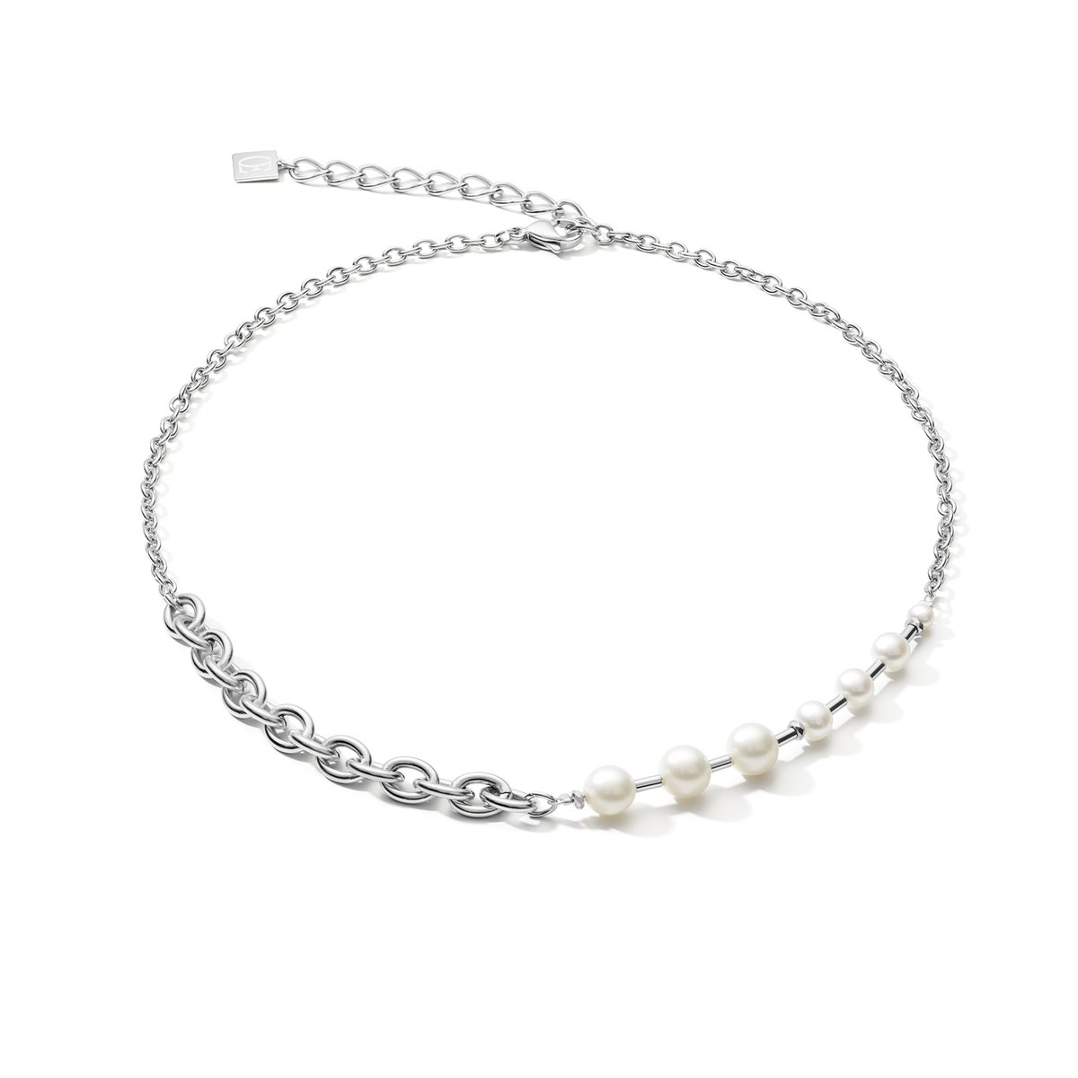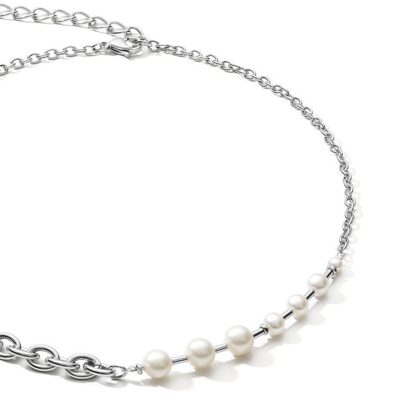 A fresh take on a classic piece of jewellery. The sophisticated design combines freshwater pearls with fine and chunky stainless steel chain. Handmade at our studios.