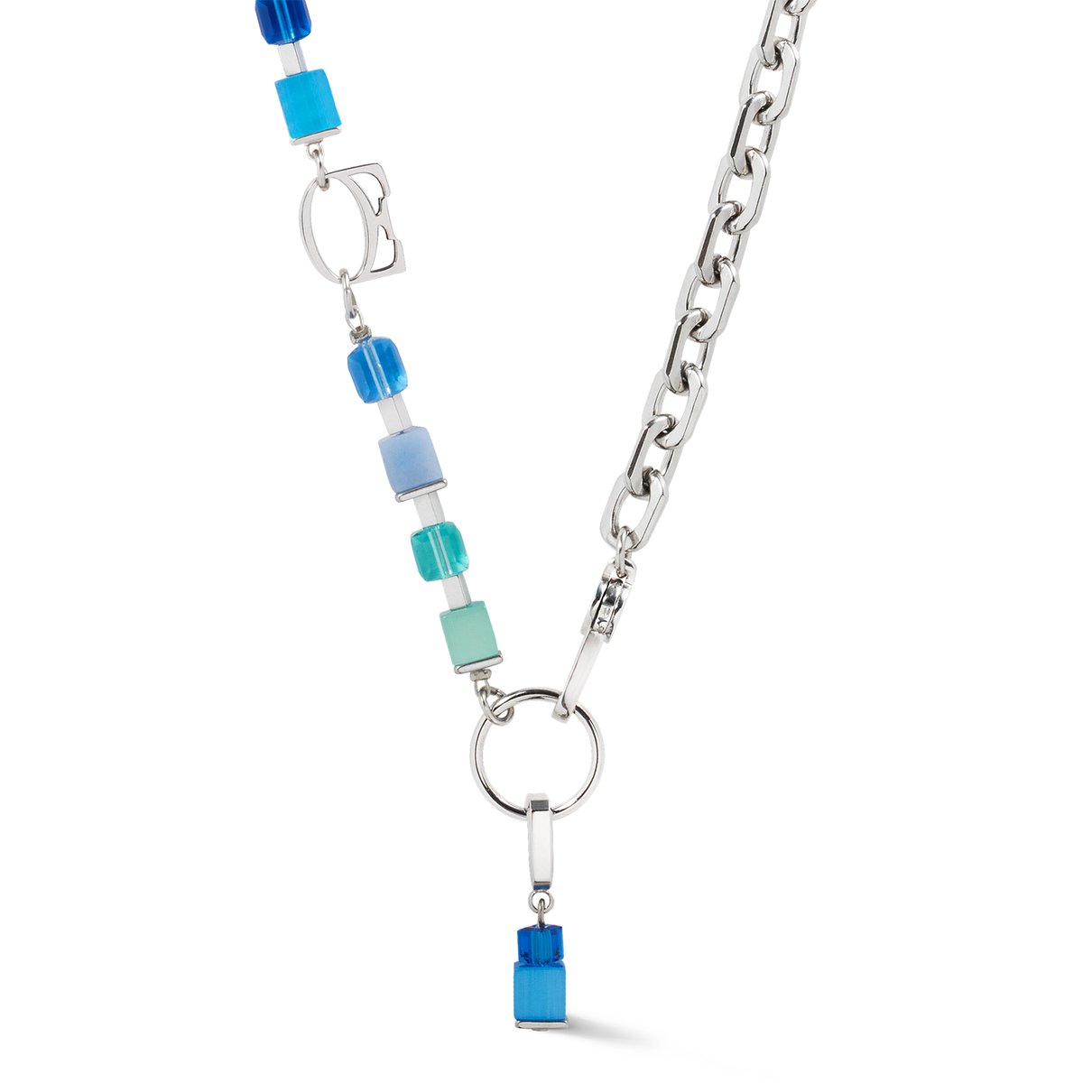 Clear lines, strong look — the Cube Fusion Charm Silver-Ocean necklace combines Swarovski® cubes with opaque and clear glass cubes in cool blue tones. The striking stainless steel link chain emphasises the modern design, while the detachable charm allows for flexible wearing options. Thanks to the multi-wear option, the necklace can be extended with the matching bracelet and worn as a long chain — a real statement piece with an urban character.