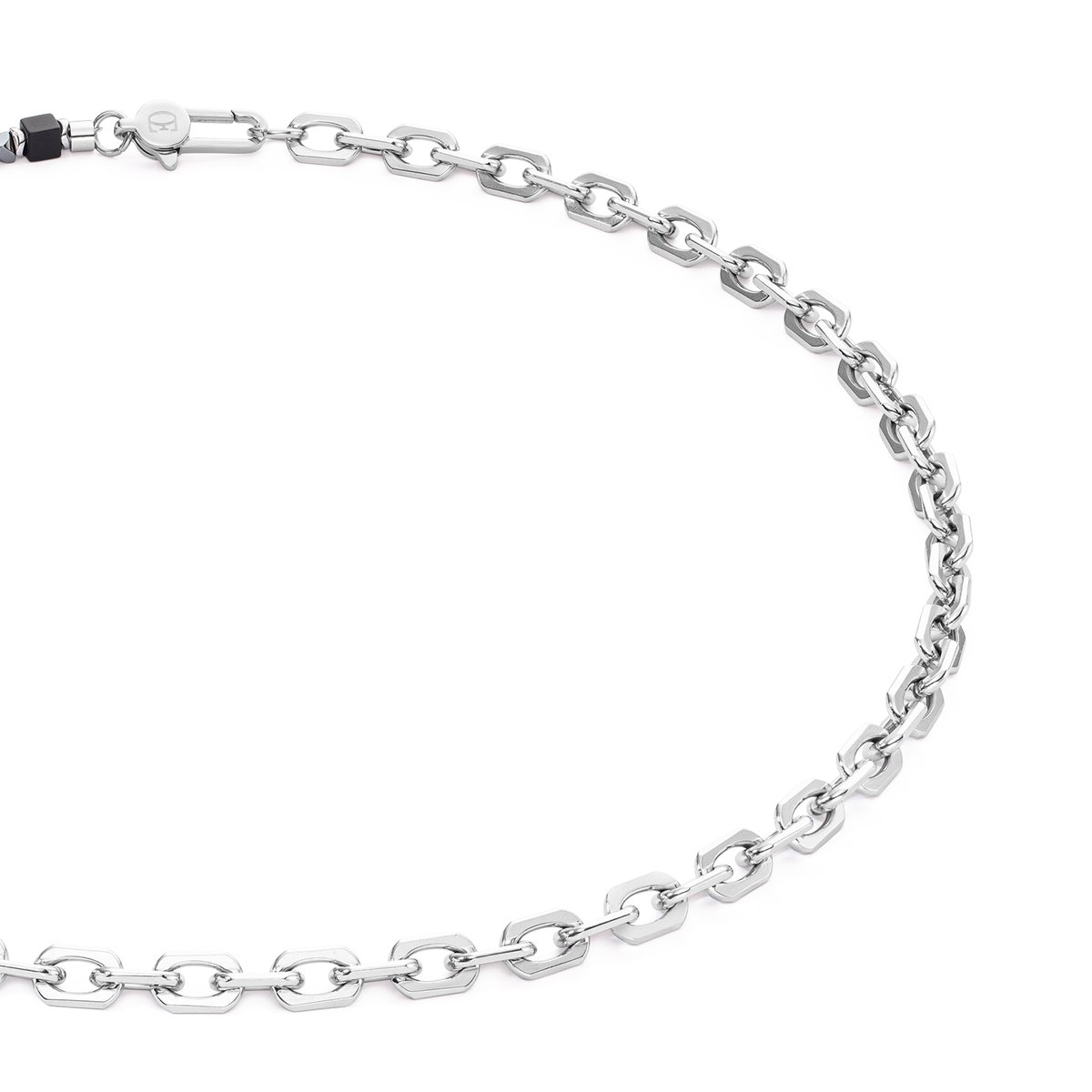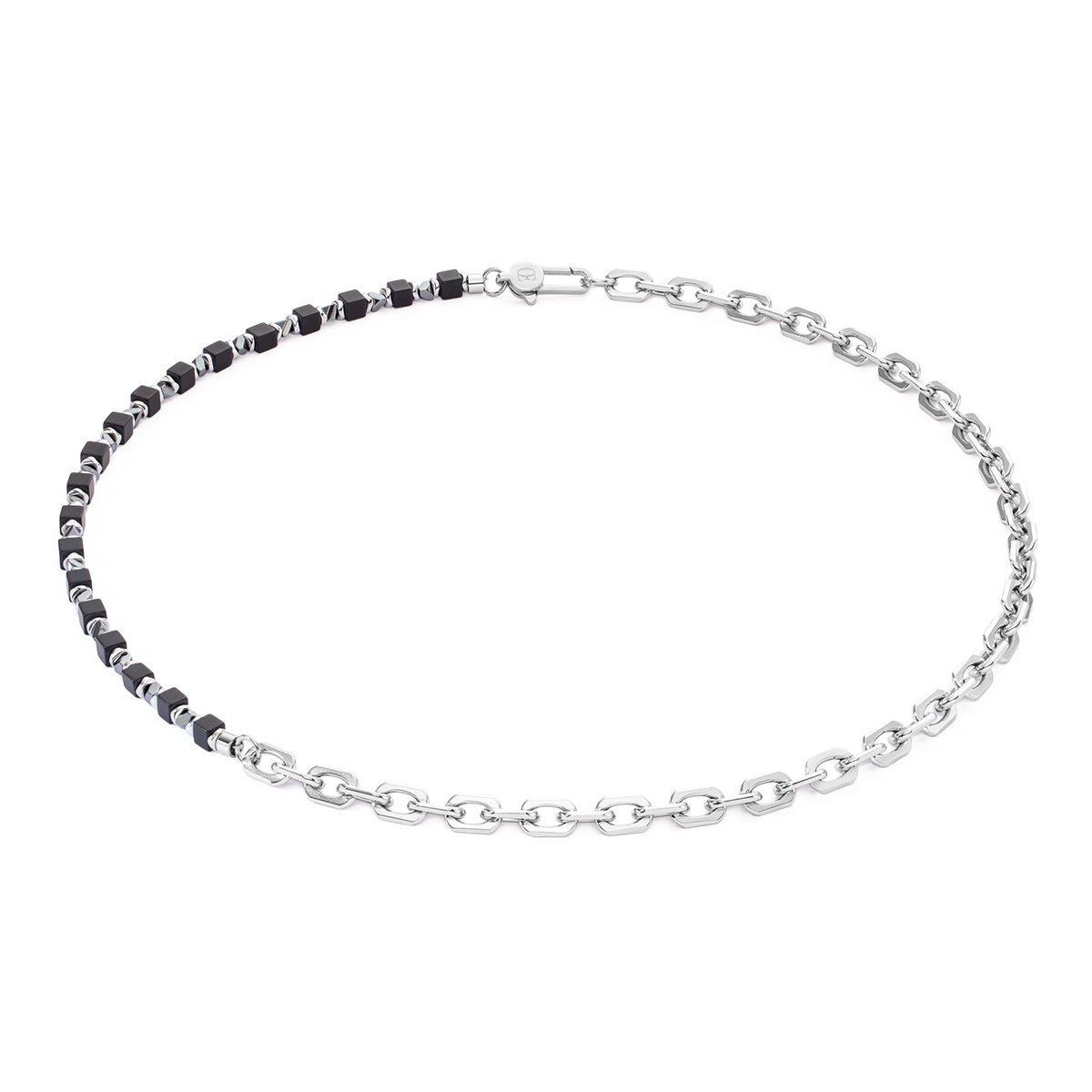 Tradition meets trend with the Cubes Fusion black link chain necklace. The stoic beauty of onyx cubes is combined with the futuristic shimmer of haematite and the reliability of stainless steel. This necklace with its creative asymmetrical design can be worn as a bold eye-catcher or as a complement to the matching bracelet.