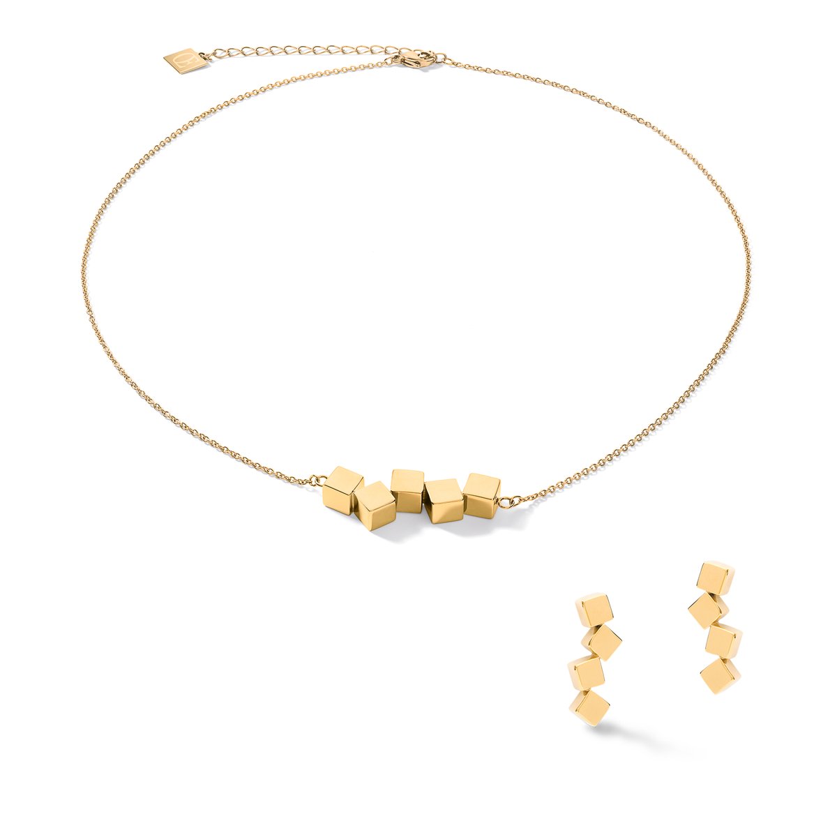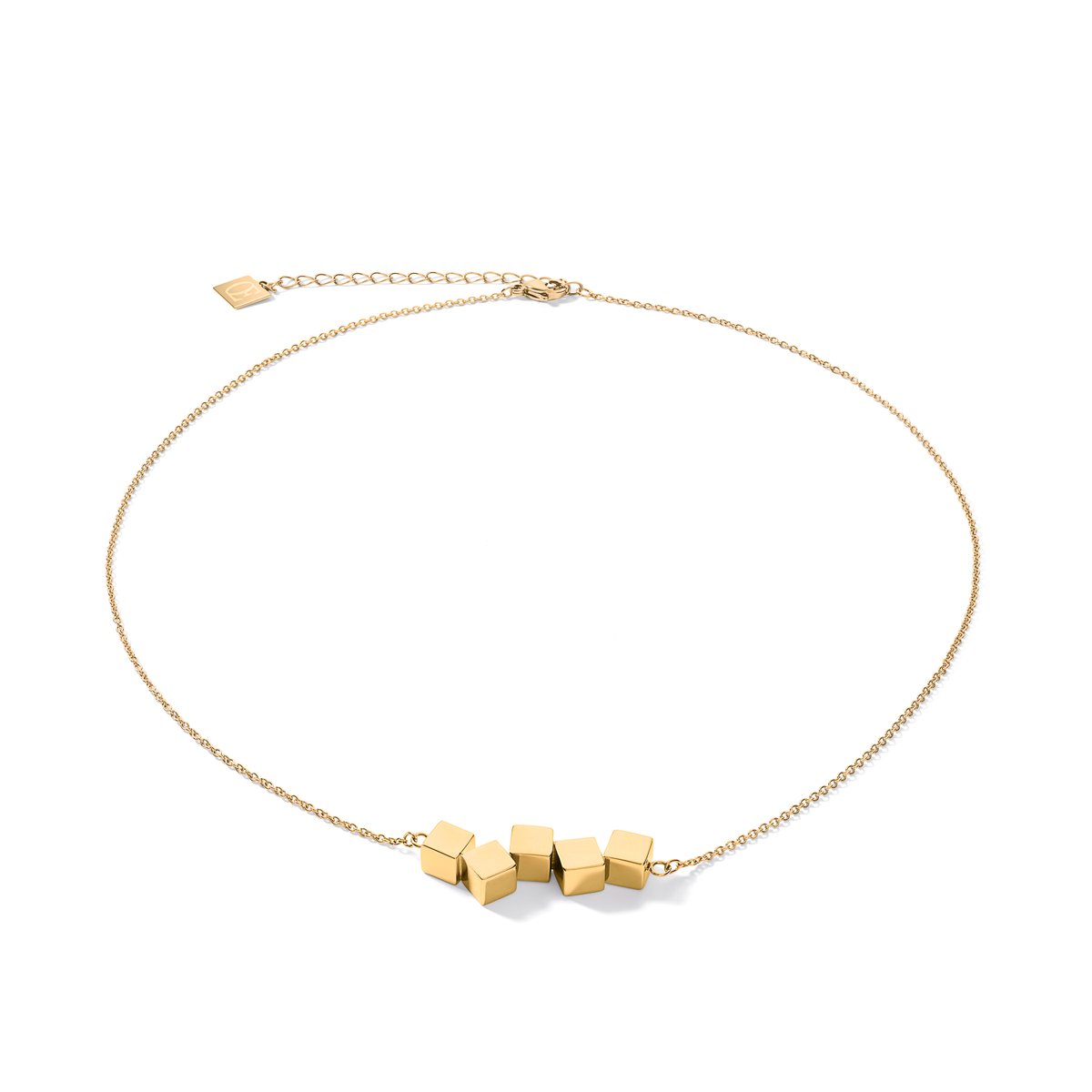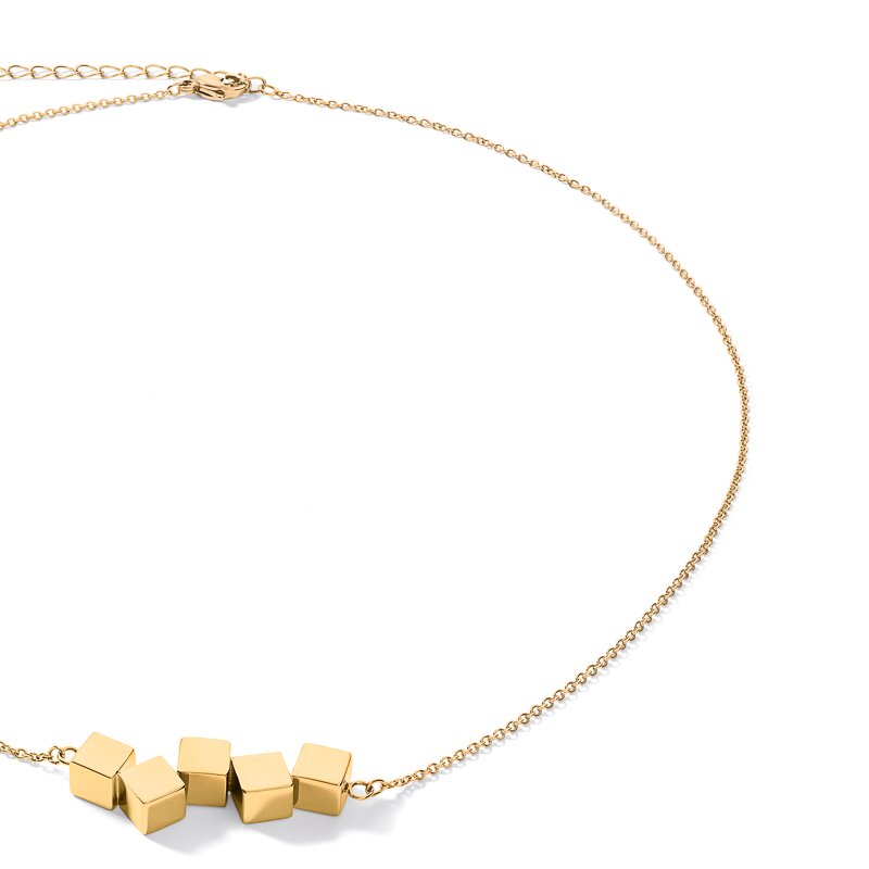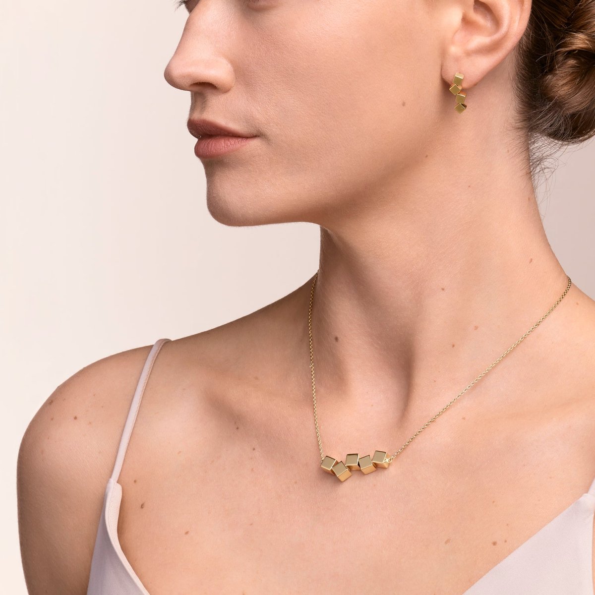 Pared down, minimalist, sculptural: this elegant necklace incorporates COEUR DE LION’s trademark cubes in a stylish cluster. It can be combined with other necklaces from the set for an effortless layered look. This design also comes in silver and rose gold. As always, a coordinating bracelet, earrings and ring are available as well.