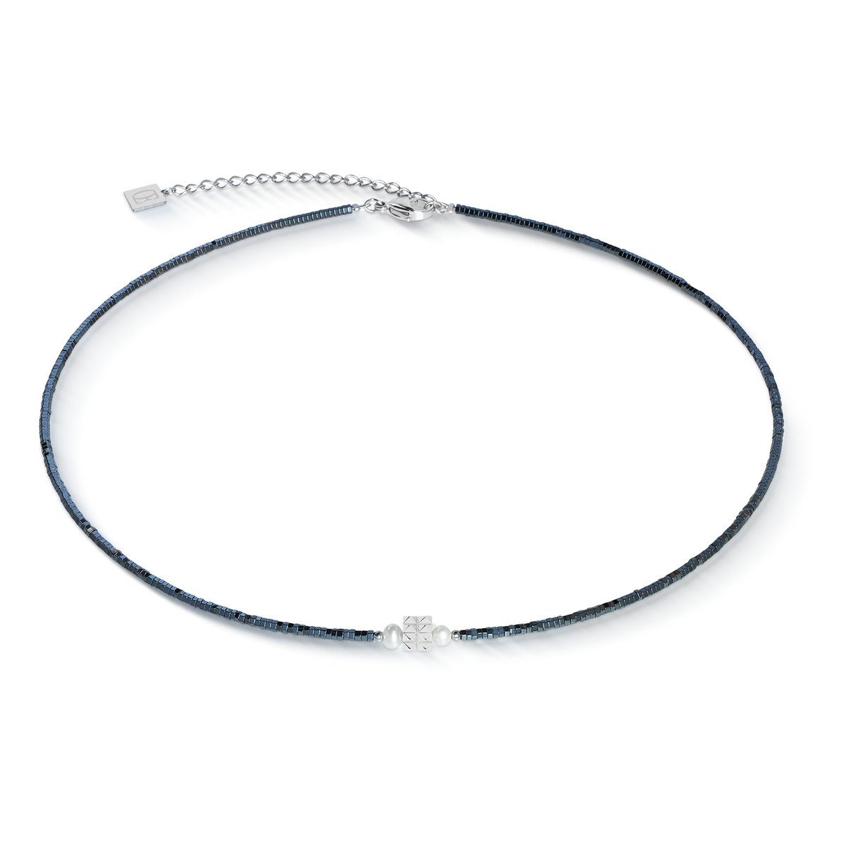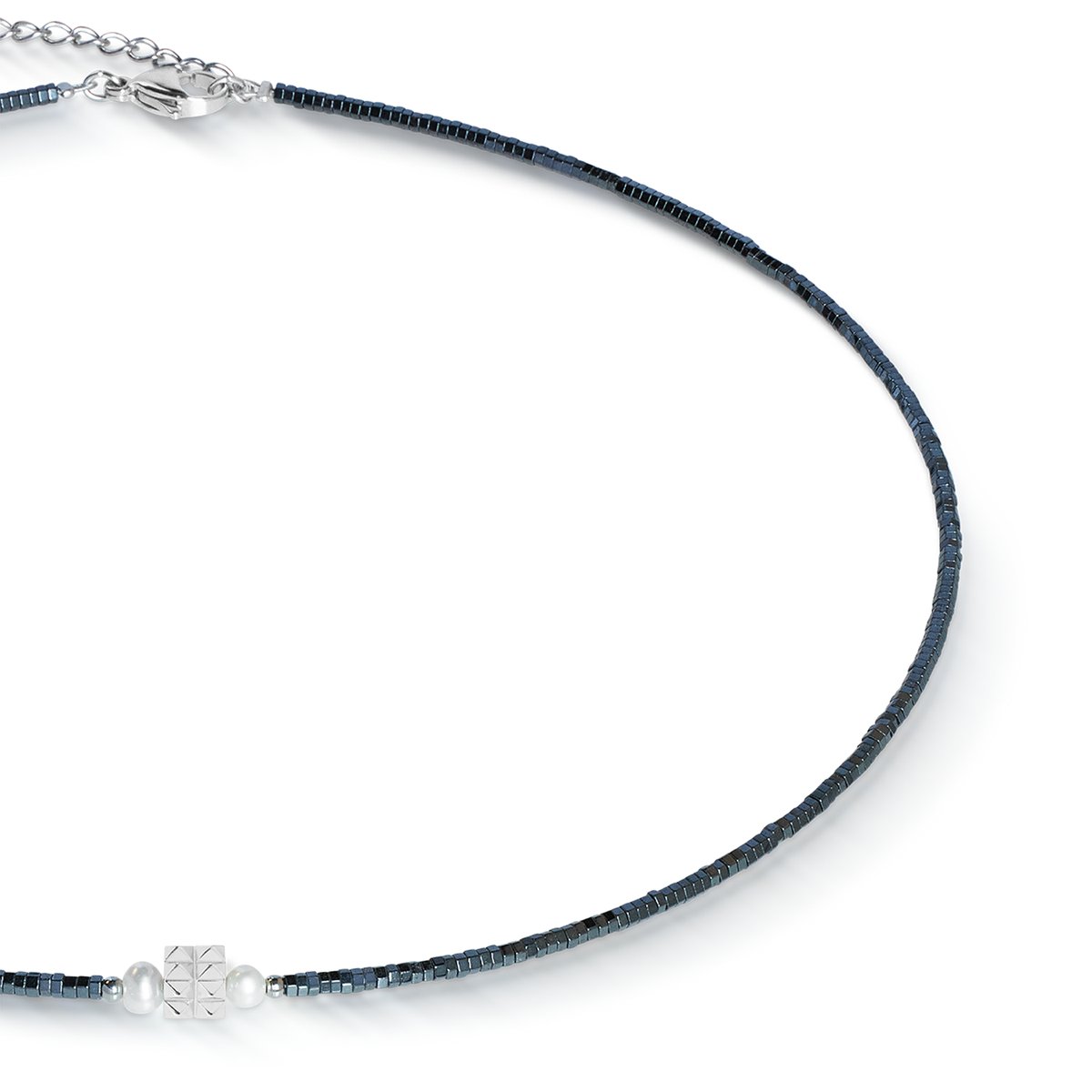 Clear lines meet strong details: the Edge & Grace necklace in anthracite silver combines cool, shiny haematite with stainless steel and shimmering freshwater pearls. In the centre: a powerful spiked cube that gives the design a striking twist. The look? Simple but with attitude — perfect for urban styles, clean outfits and anyone who likes things minimalist but not boring.
