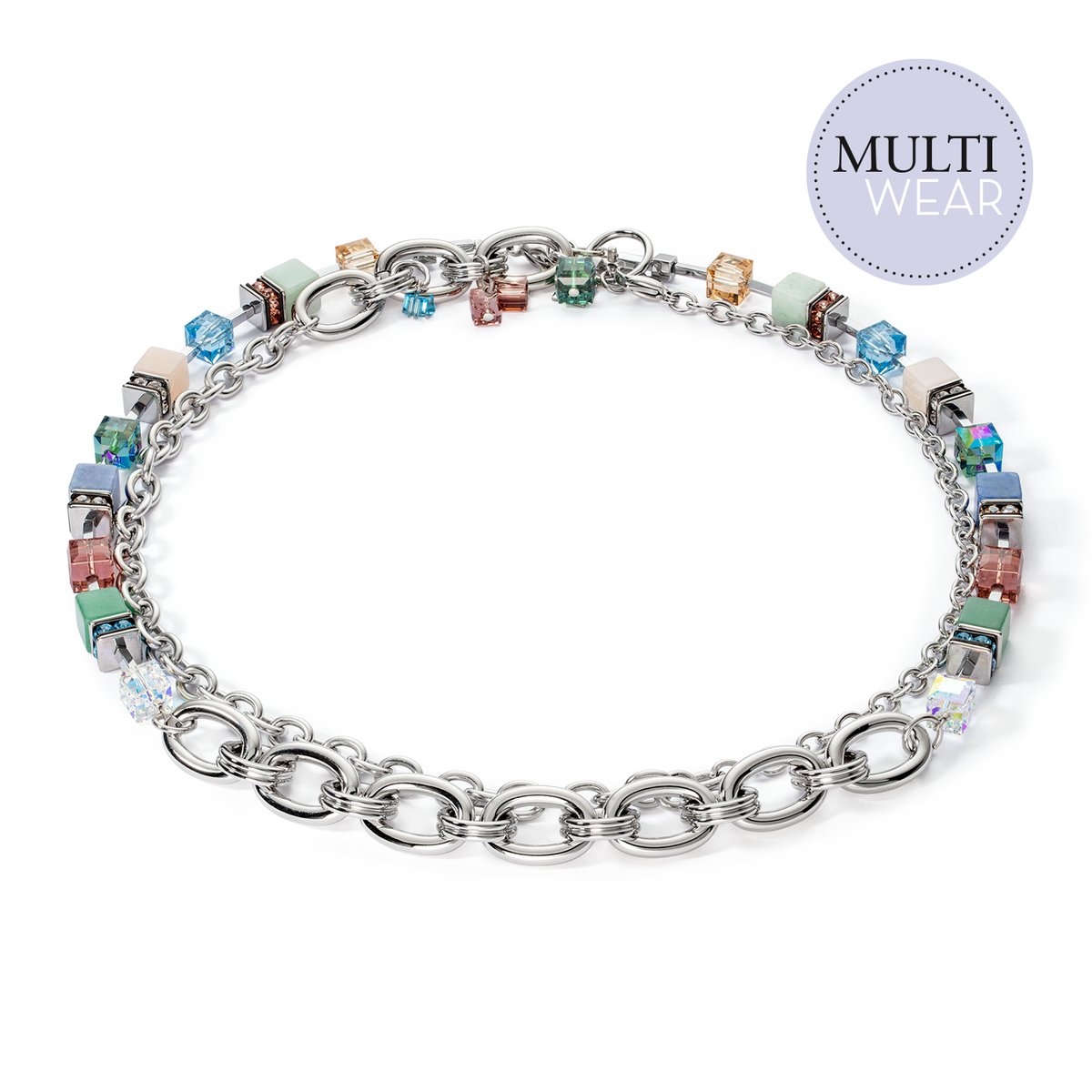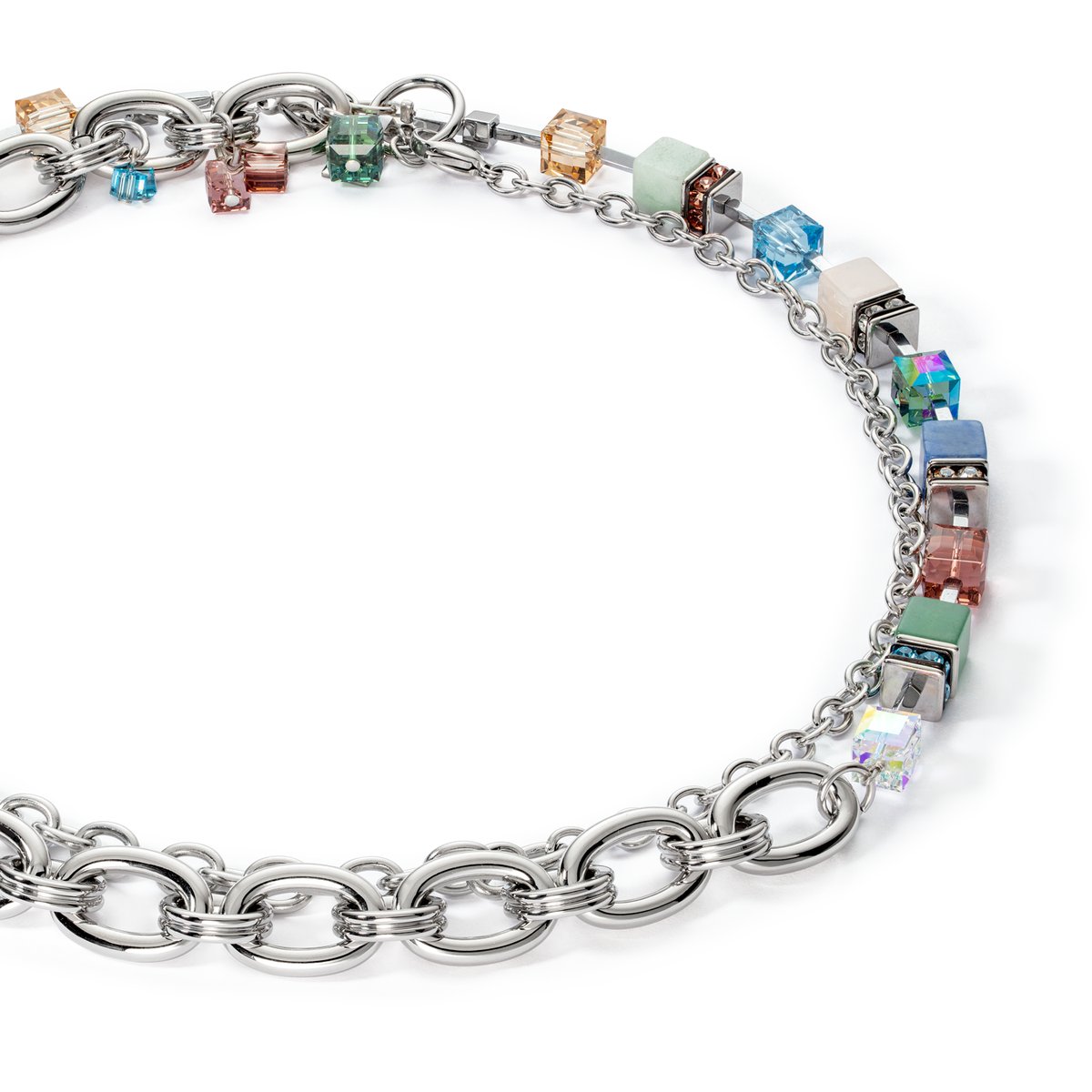 A bold and innovative reinterpretation of a famous design: iconic GeoCUBE® in a new size made from natural stones, combined with different chunky chains to create an exciting statement piece. This striking anniversary special can be worn in various ways, giving the wearer’s creativity free rein. It can be worn long, short, as individual chains or as a Y-shaped necklace. The matching bracelet and earrings feature the same fresh look for a breathtaking addition to any outfit.