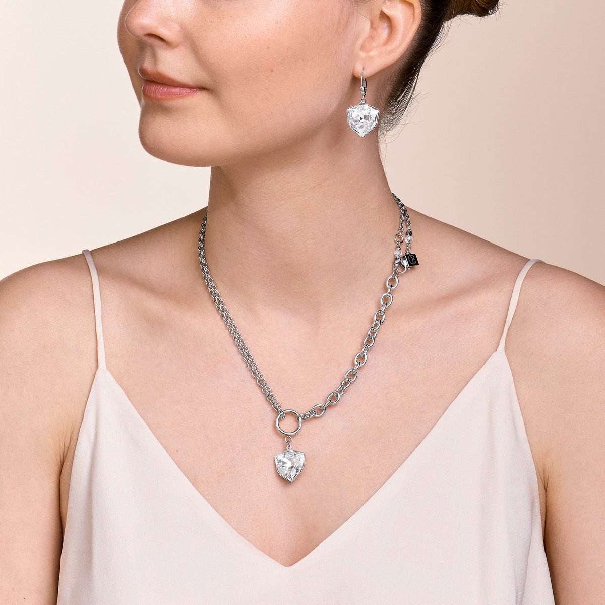 Featuring a magical Swarovski® crystal as a pendant, this necklace turns heads. The breathtaking necklace can be worn in various ways and comes with matching earrings.