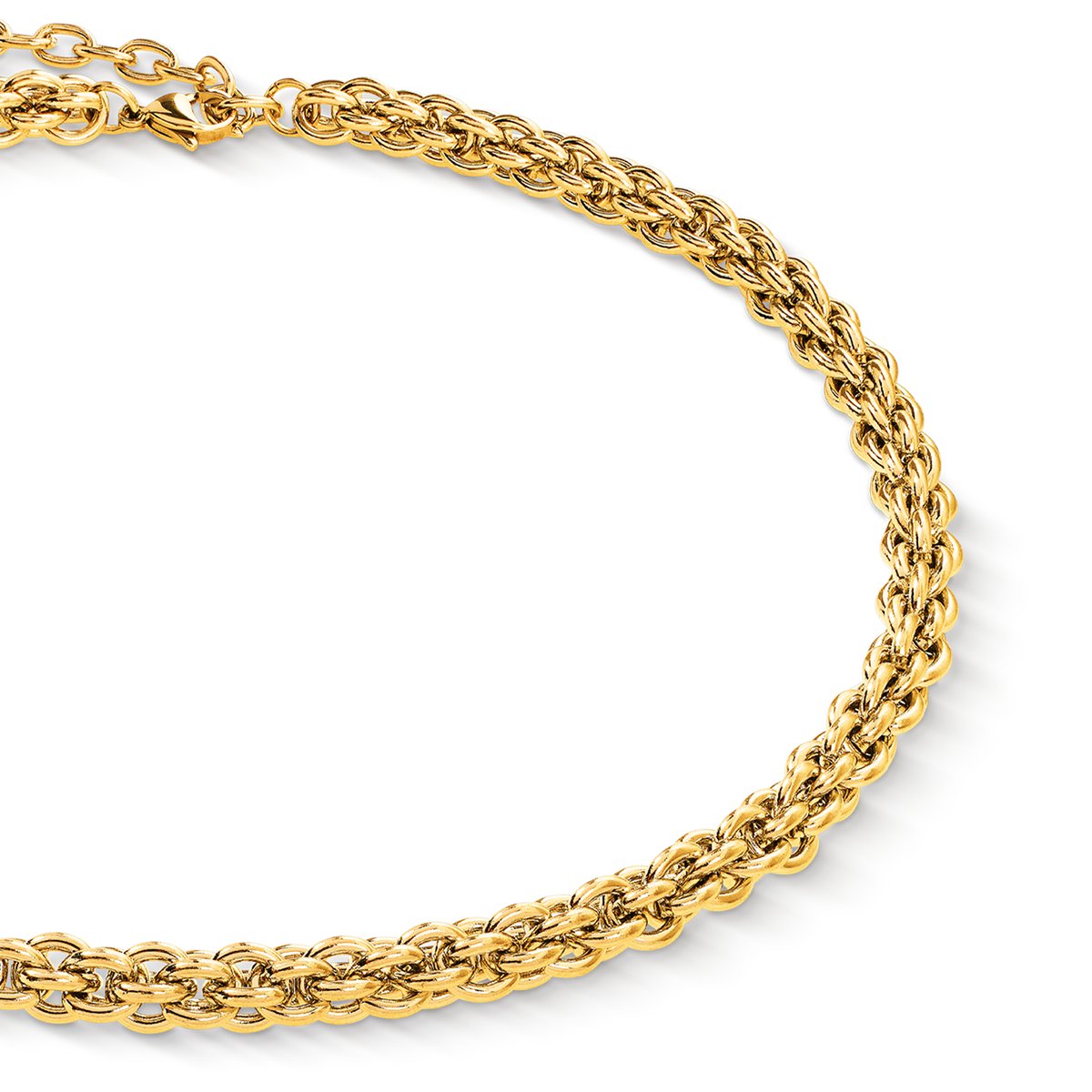 A real highlight for anyone who loves clear shapes and elegant glamour: The gold stainless steel necklace in a braided mesh chain design impresses with its high-quality workmanship and striking look. The round linked structure makes it a classic statement necklace — ideal for strong solo appearances or as a complement to the matching bracelet. If you prefer a simpler look, this is the understated alternative to the expressive Mesh Chain gold multi-wear necklace — elegant, pure and timeless.