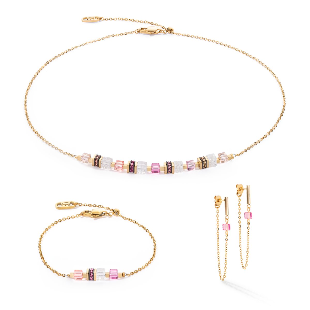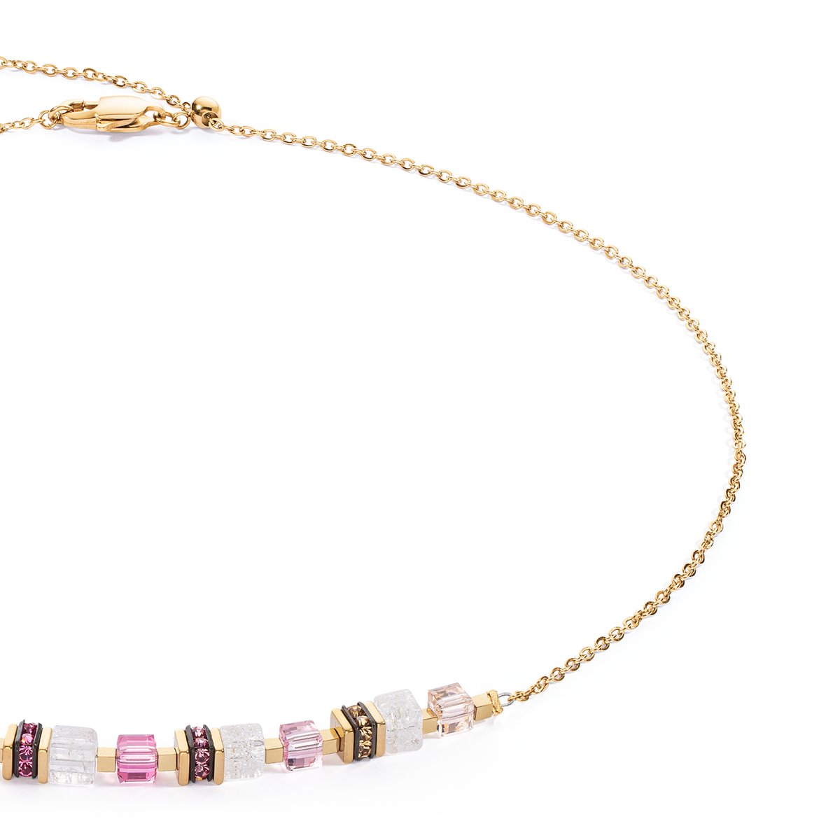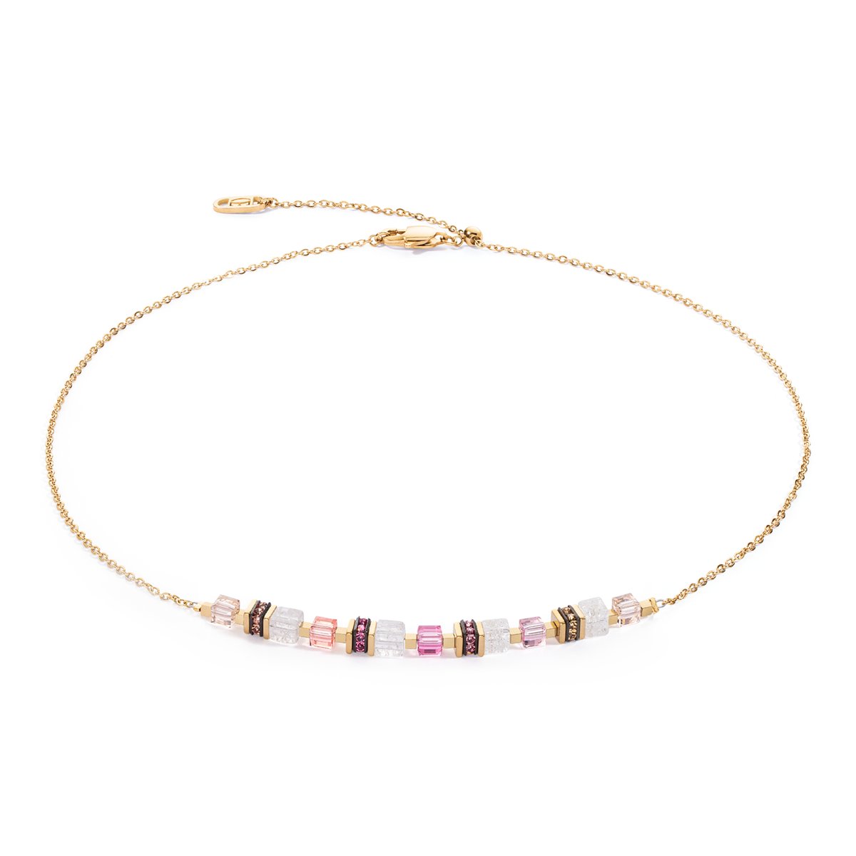 Enjoy the simple elegance of our Mini Cubes & Chain necklace in gold-pink — a sophisticated piece of jewellery that enchants with its delicate design and the unique charm of the materials. This piece of jewellery combines the timeless beauty of real stone cubes such as rock crystal with the dazzling brilliance of Swarovski crystals. The innovative sliding clasp ensures a customised fit and allows you to adjust the length of the chain as desired, ensuring optimum comfort and versatile styling options.