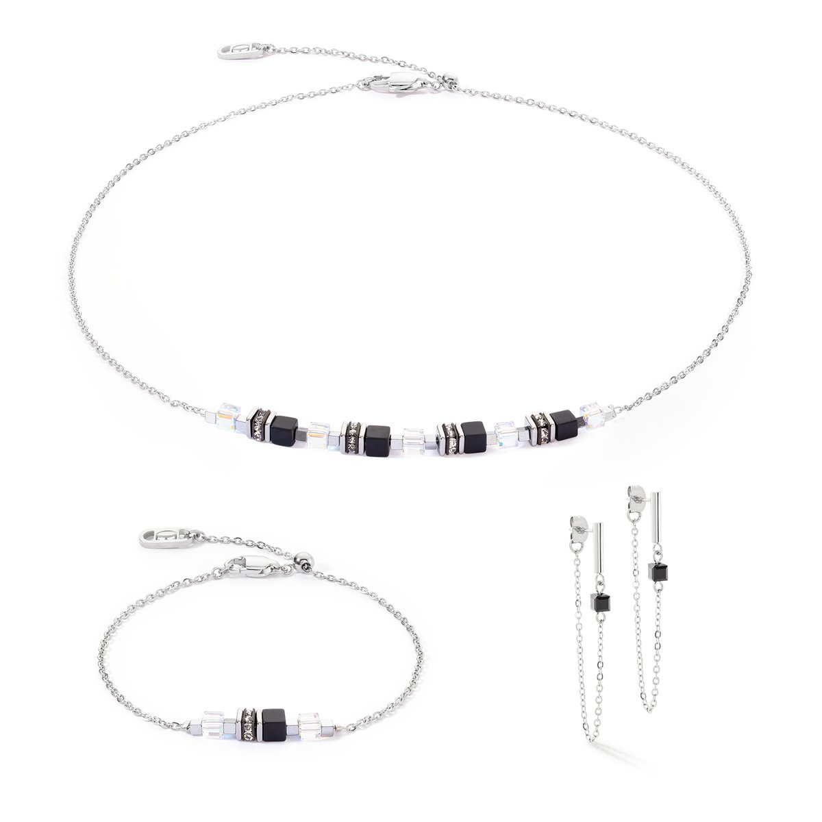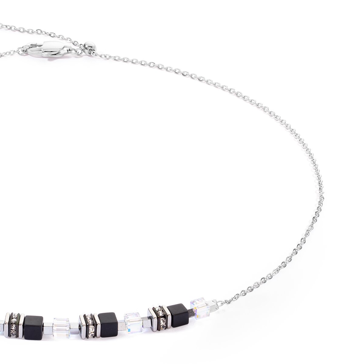 The «Mini Cubes & Chain» necklace in silver and black impresses with its simple elegance and sophisticated design. This piece of jewellery enchants with its delicate design and the unique charm of the materials. The necklace combines the timeless beauty of real stone cubes such as black onyx and rock crystal with the dazzling lustre of Swarovski crystals. The innovative sliding clasp ensures a customised fit and allows you to adjust the length of the necklace as desired. This offers optimum wearing comfort and versatile styling options. Matching earrings and bracelet from the same collection round off your look perfectly. COEUR DE LION offers you the highest quality and a timeless design that sets elegant accents.