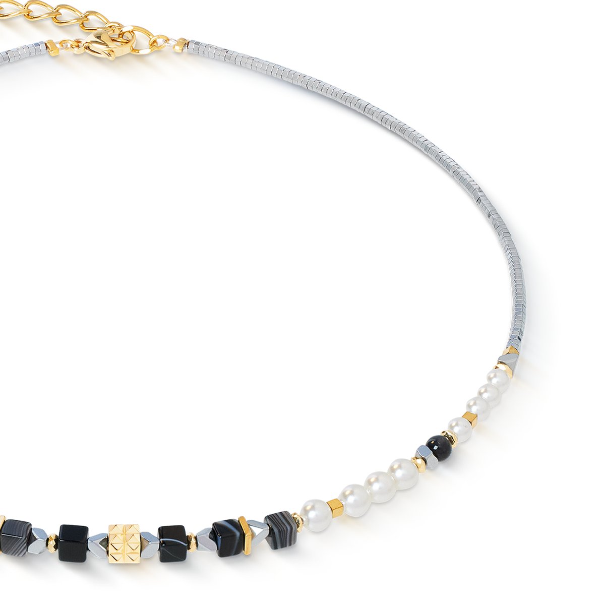 The Modern Elegance Spikes gold necklace combines modern clarity with natural uniqueness. The centrepiece is a striking spikes cube made of gold-plated stainless steel, flanked by shimmering Crystal Pearls by Swarovski®, hematite with a titanium oxide finish and elegant striped onyx. As onyx is a natural stone, each piece of jewellery has its own distinctive stripes, which sometimes appear stronger, sometimes finer — making each necklace truly unique. Handmade in Germany, it combines high-quality materials with timeless elegance and can be ideally combined with other pieces of jewellery from the Spikes series.