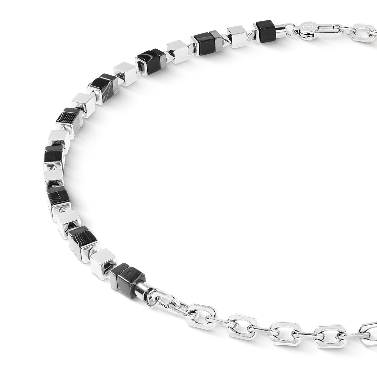 The Precious Cubes Chain necklace in black and silver plays with exciting contrasts: striped onyx cubes meet shiny haematite with a titanium oxide finish — connected by striking links made from high-quality stainless steel. The precise cubic design gives the necklace a powerful, modern expression. Whether worn as men’s jewellery or in an elegant unisex style, this statement piece adds character to any look and can be perfectly combined with the matching bracelet.
