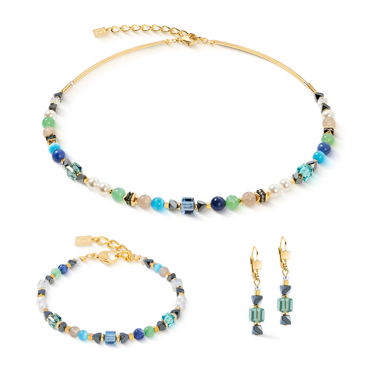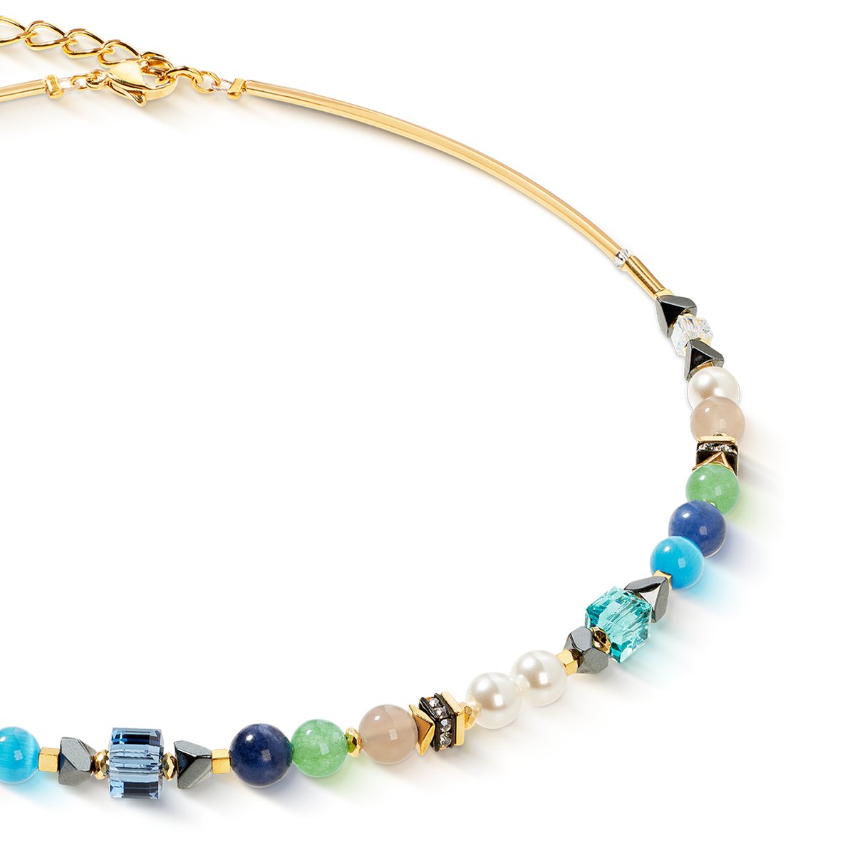 Fresh, colourful and full of lightness: this necklace celebrates the mix of shape and colour — with green aventurine, deep blue sodalite, delicate agate, shimmering Crystal Pearls by Swarovski® and sparkling crystals. Accents of haematite, synthetic tiger’s eye and gold-plated stainless steel lend the design depth and elegance. The varied mix of shapes in shades of green and turquoise looks playful, natural — and simply unique.
