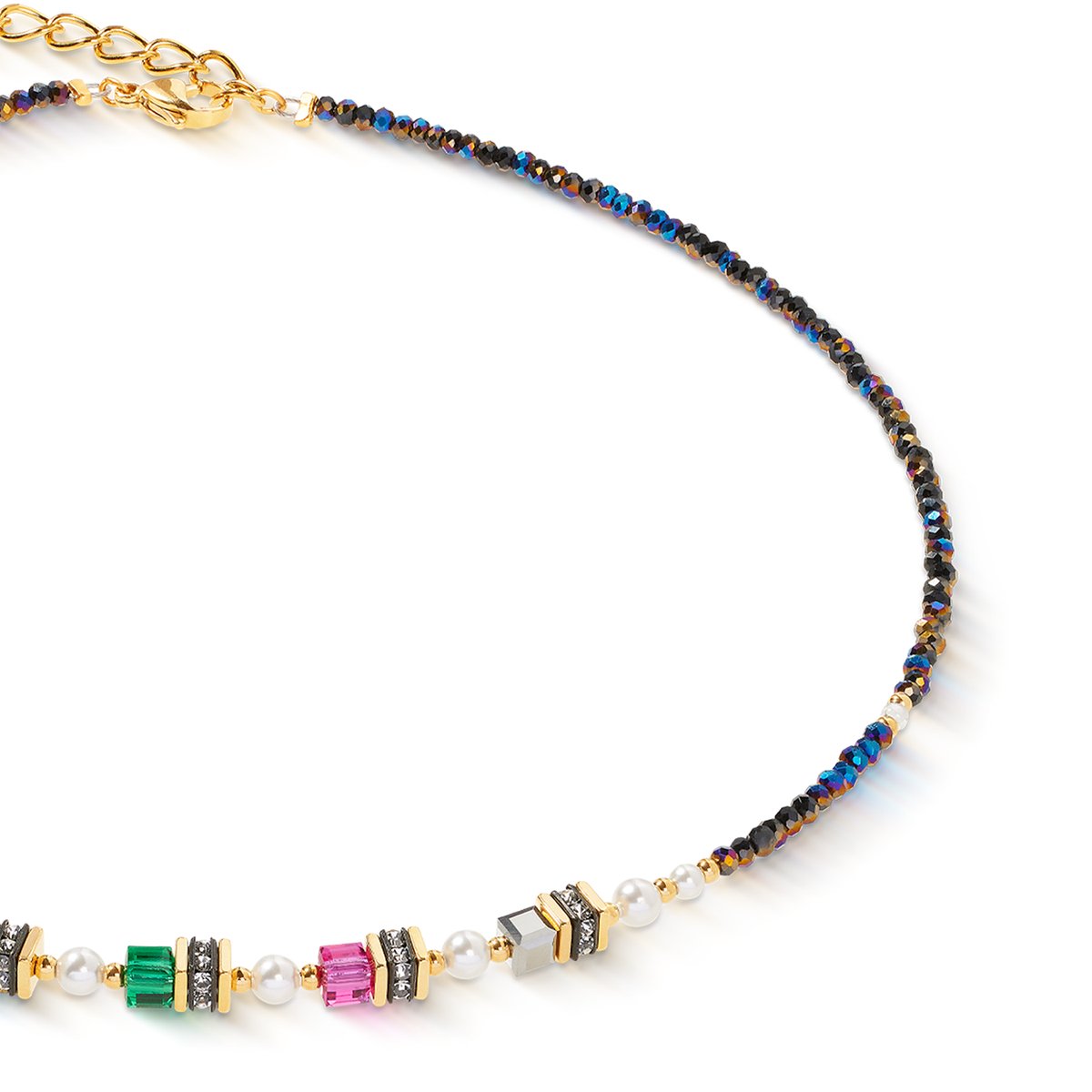 A blaze of colour in elegant harmony The Sparkling Princess couture necklace combines shimmering Crystal Pearls by Swarovski® with luminous Swarovski® crystals and fine crystals to create an intensely colourful composition. Radiant blue, lush green, vibrant pink and clear white combine with gold-coloured details to create an ensemble reminiscent of royal elegance. The delicate arrangement of the various elements makes the necklace appear light and expressive at the same time, a piece of jewellery full of radiance that enhances any look and combines festive elegance with modern design.