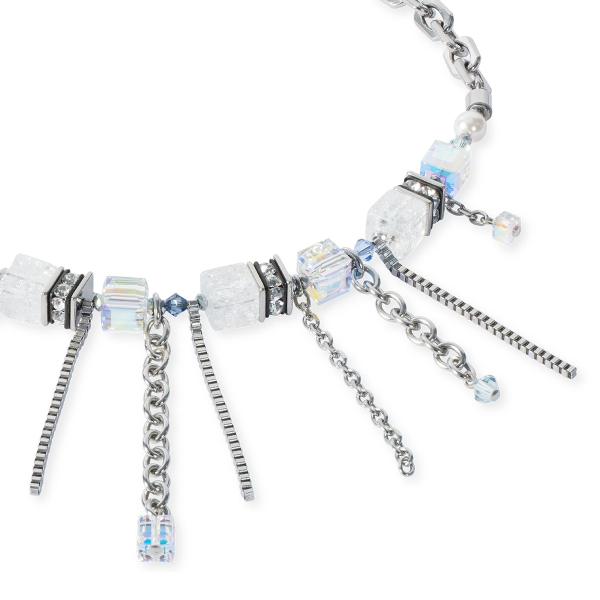 Unconventional, sophisticated, absolutely couture — the Sunray Cube Bohème silver-white necklace combines shimmering rock crystal cubes with precisely cut Swarovski® cubes that capture the light in a gentle glow. The movable ray elements made of silver-coloured stainless steel give the piece of jewellery an exclusive, almost weightless dynamic — like rays of sunshine that dance with you. The multi-wear option allows you to extend the necklace with the matching bracelet and create an even more personalised look.