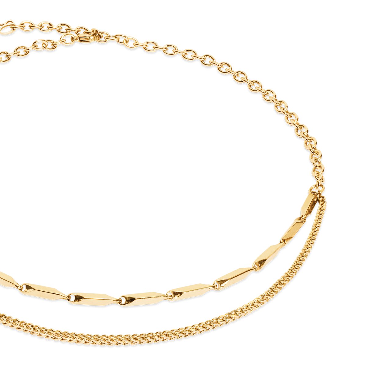 Stylish, modern, distinctive – the Twisted Layers necklace is your new go-to piece for any outfit! Three different stainless steel chains merge into a sophisticated two-row layer that perfectly combines lightness and coolness. The highlight? A chain with twisted, elongated elements that makes the look exciting. Wear it solo for a minimalist vibe or layer it with your favourite necklaces. Available in elegant silver or warm gold – for a dazzling appearance every day! Matching the Twisted Layers bracelet.