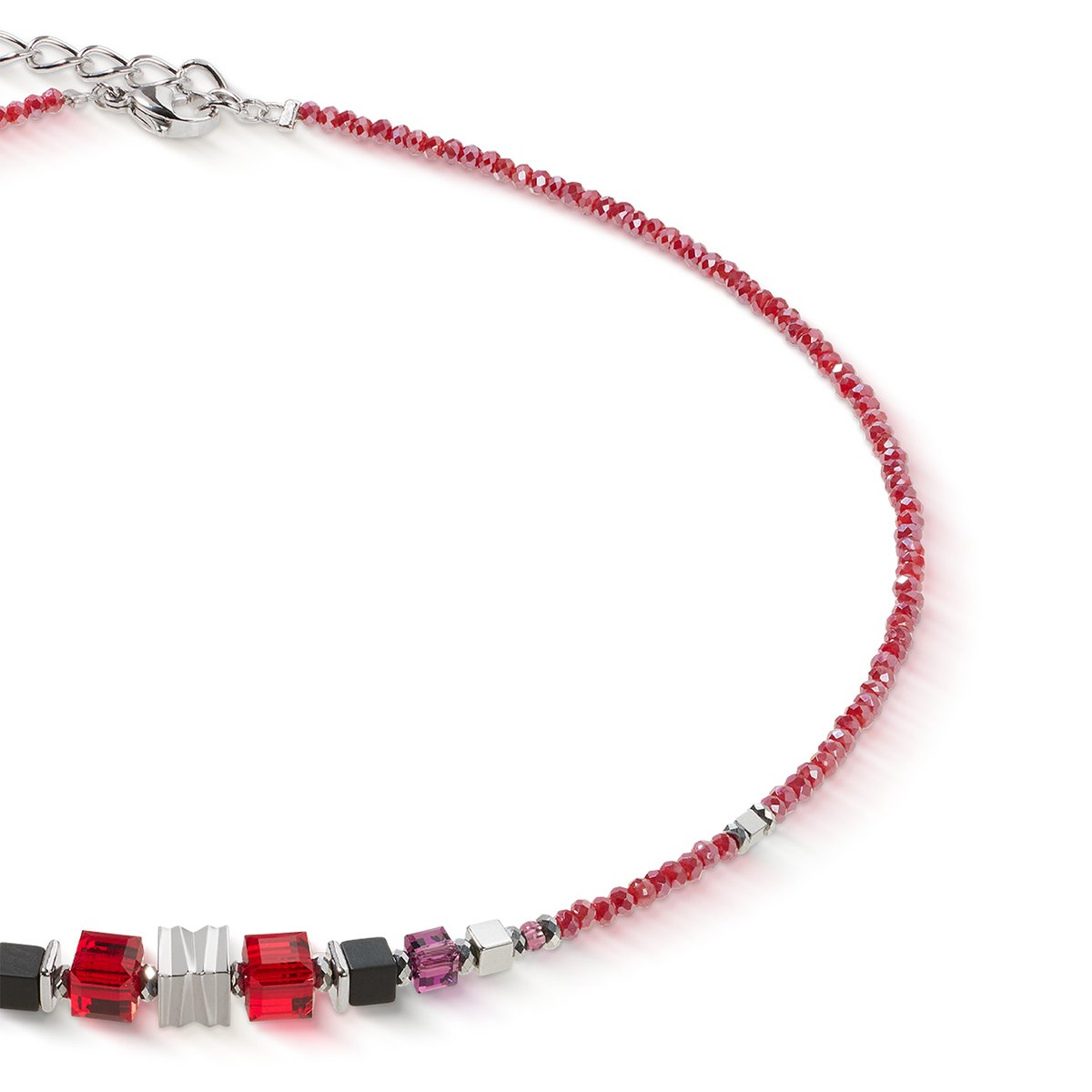 An architecturally crafted stainless steel wave cube shines at the centre of this necklace, artfully framed by deep red Swarovski® crystals, onyx cubes and shiny hematite. The design flows softly into a line of fine, sparkling glass beads that make the red colour shine vividly. Expressive, refined and clear — a piece of jewellery with character, handmade in Germany by COEUR DE LION.