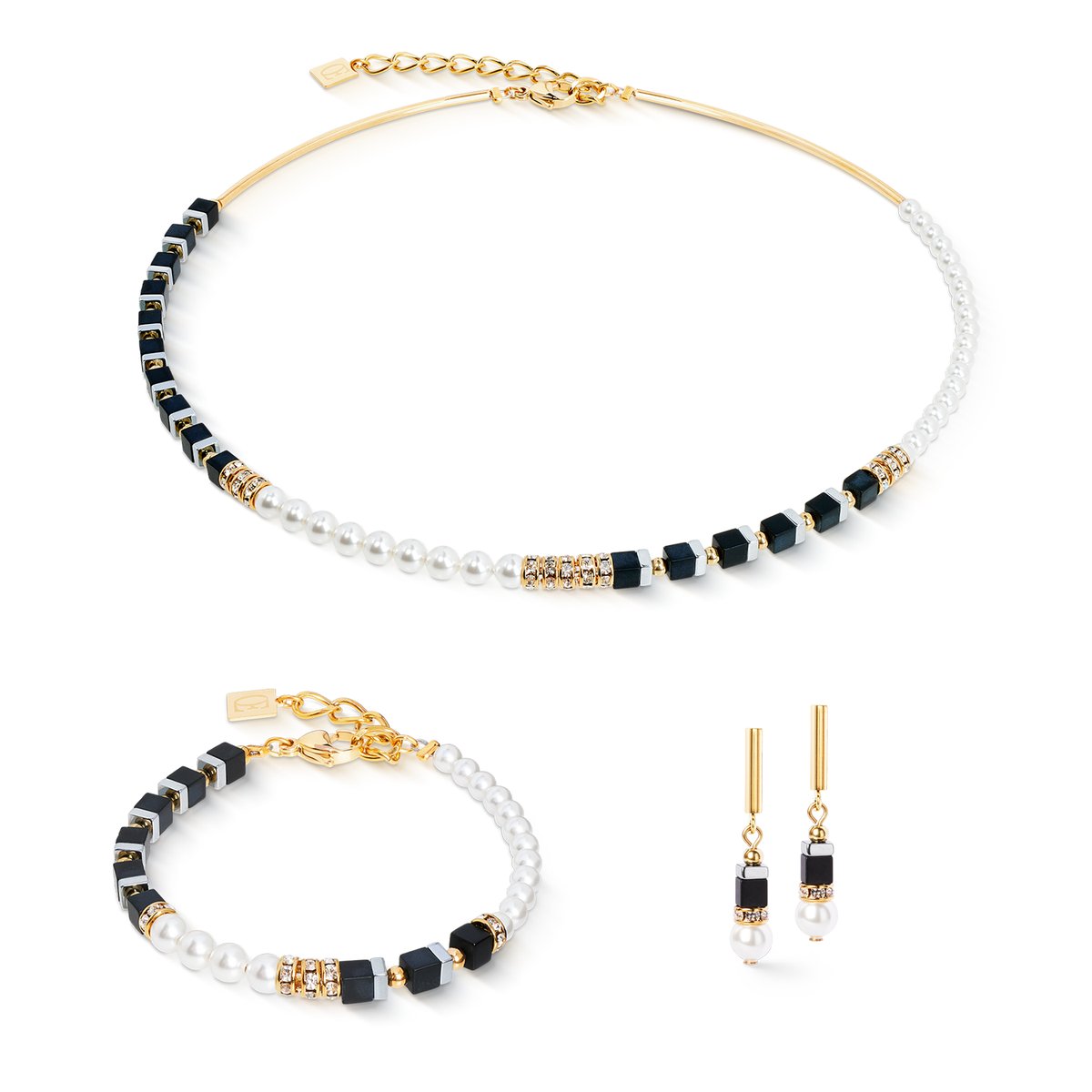 The Precious Fusion Offset bracelet black-pearl brings black and white into perfect balance. Clear gemstone cubes made of onyx and refined haematite meet shimmering Swarovski® Crystal Pearls and sparkling crystals. Gold-coloured stainless steel details round off the design and add a touch of luxury. Elegant, modern and incredibly versatile — this bracelet suits every occasion and is a must-have for lovers of timeless jewellery classics.