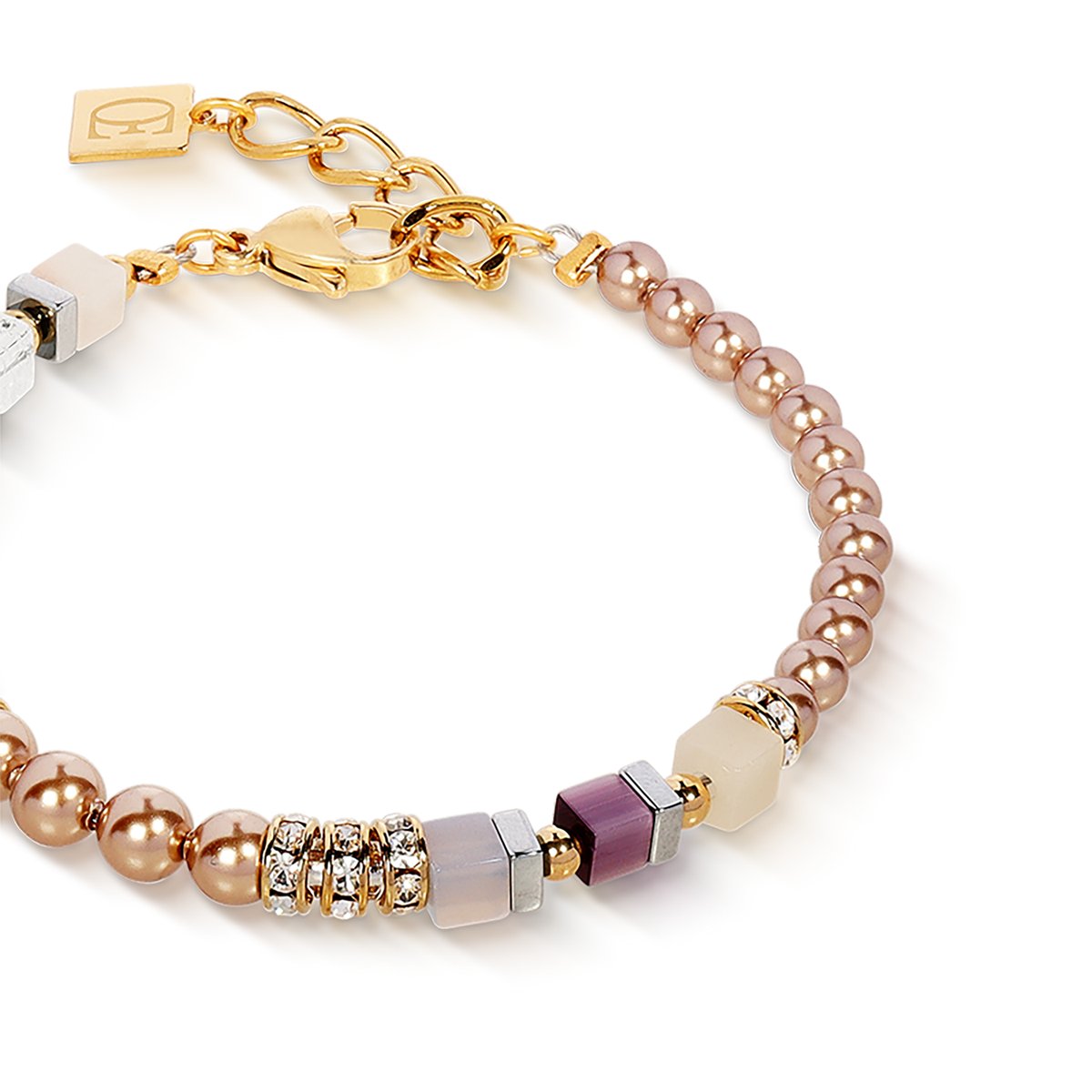 The Precious Fusion Offset bracelet in champagne blush combines festive elegance with a modern twist. Gemstone cubes of pink aventurine, agate and rock crystal meet shimmering Swarovski® Crystal Pearls, sparkling crystals and refined haematite. Gold-coloured stainless steel rounds off the design, while the soft colour palette of rosé and champagne tones adds warmth and sparkle. A sophisticated eye-catcher that is suitable as a gift for special people as well as a luxurious extra for yourself.
