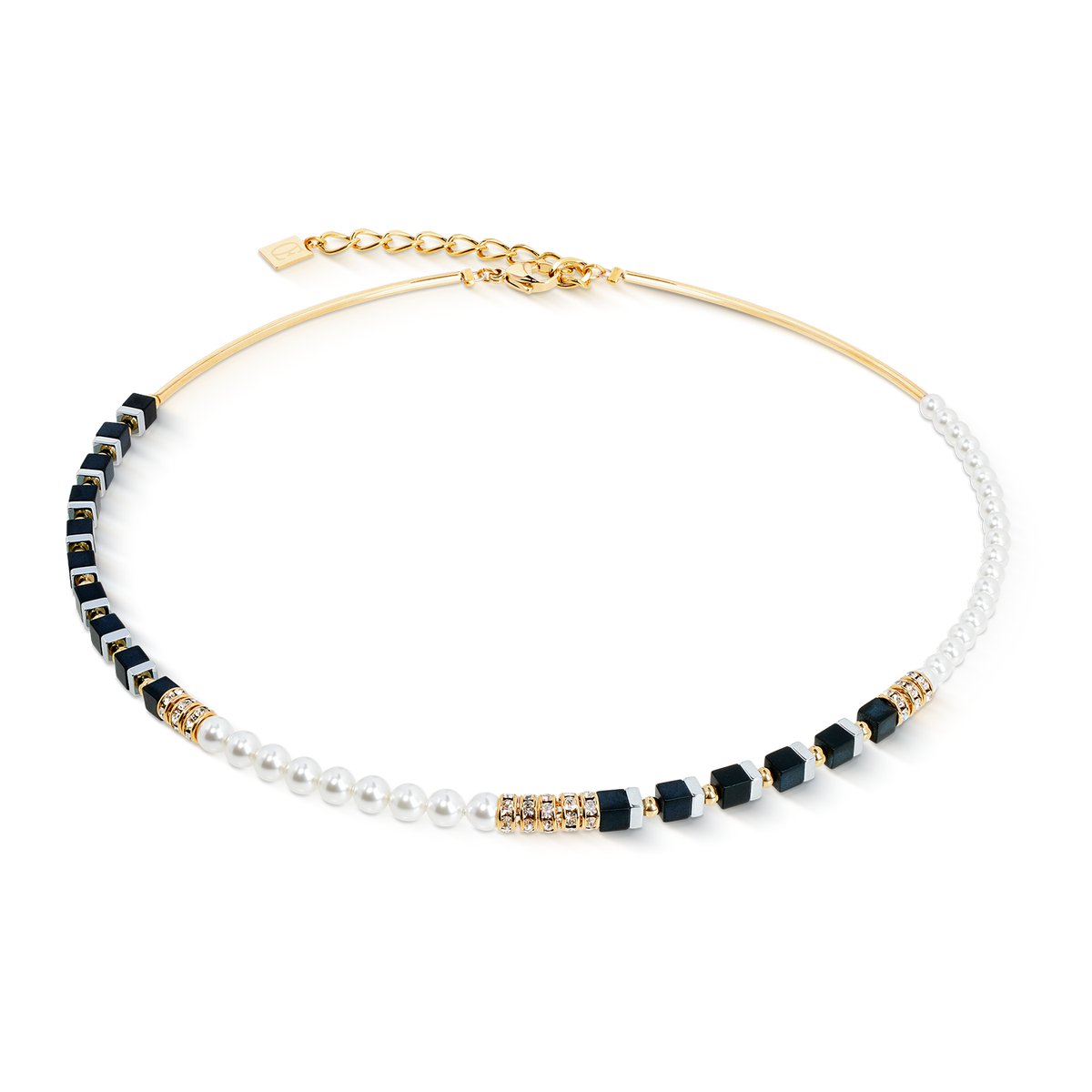 The Precious Fusion Offset necklace black-pearl is a modern classic that never goes out of fashion. Deep black onyx meets shimmering Crystal Pearls by Swarovski® and sparkling crystals, accentuated by refined haematite and gold-coloured stainless steel. The interplay of contrasts — elegant, clear and yet exciting — gives every outfit a special twist. Whether for festive occasions or as a stylish highlight in everyday life: this necklace is timeless elegance with a modern edge.