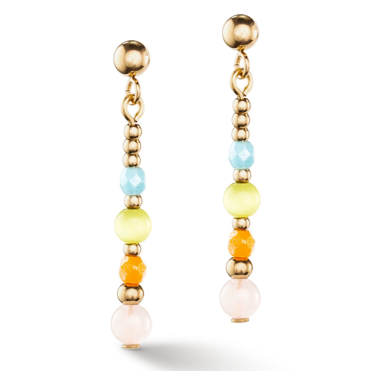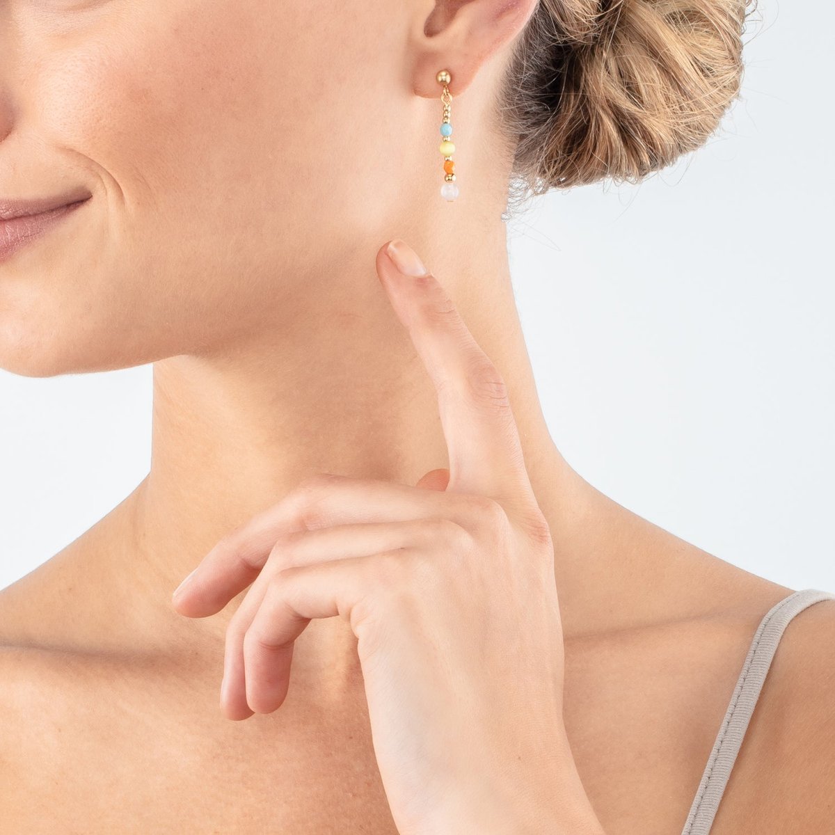 Fine dangling stud earrings with round beads in gold and multicoloured pastels.