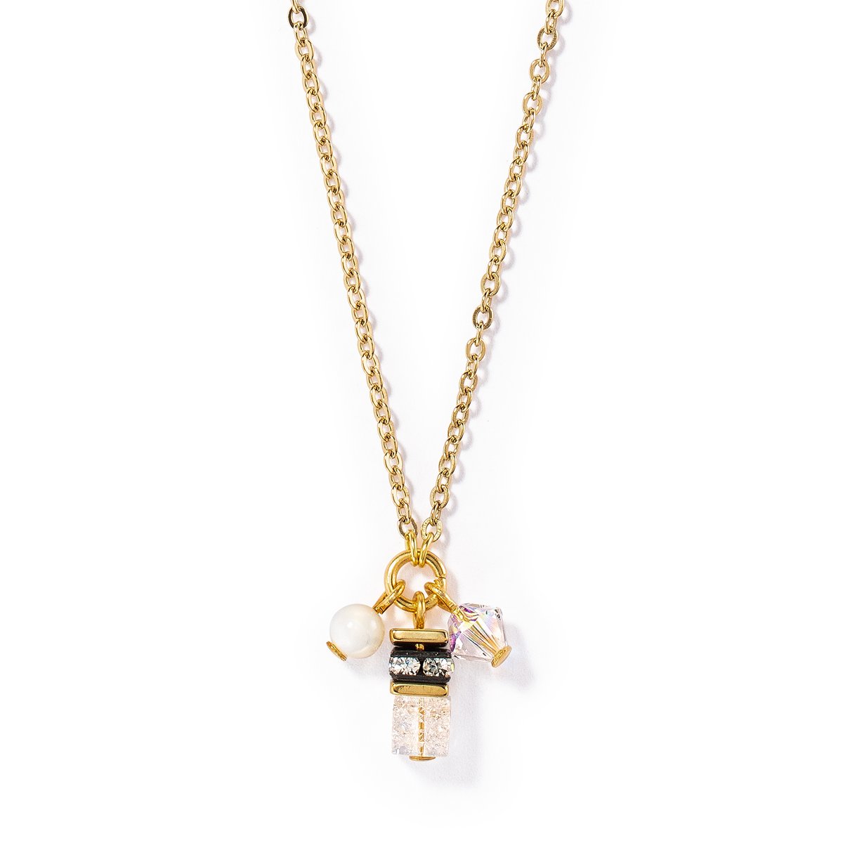 A little guardian necklace in gold with rock crystal and mother-of-pearl charms.