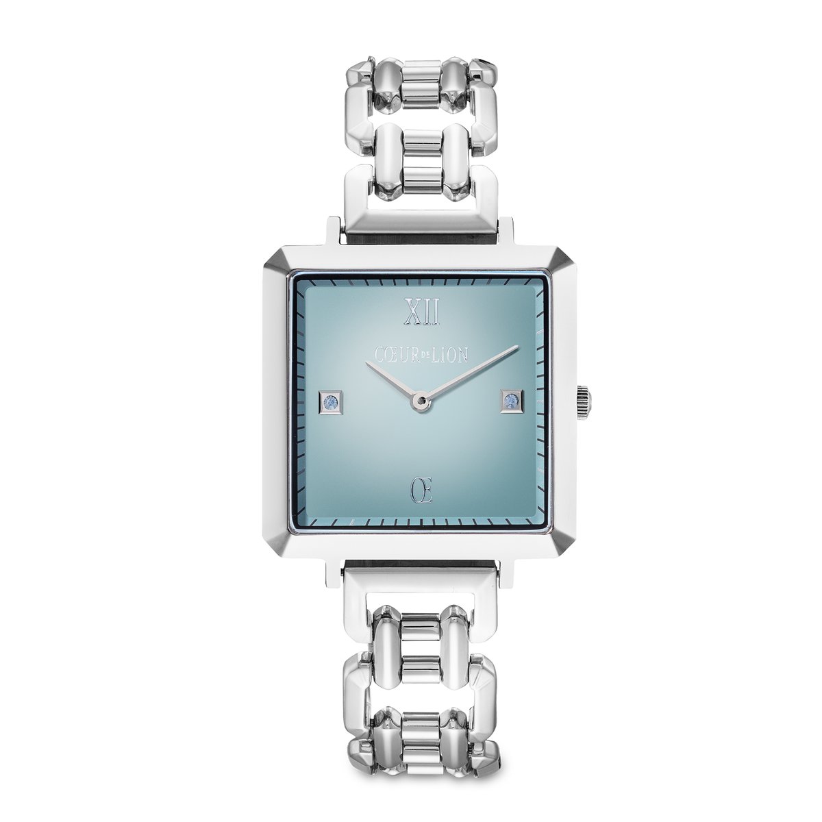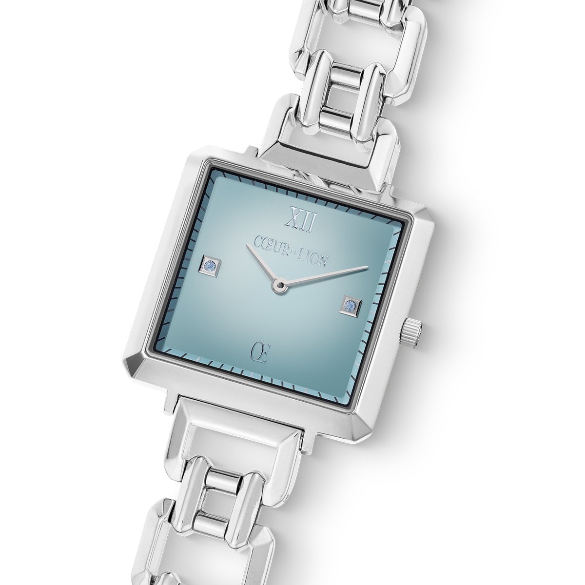 A must for the spring/summer season: the silver-coloured Iconic Cube Watch boasts a new colourway as fresh as a sea breeze. The dial in brilliant ocean cyan with colour-coordinated crystals gives the watch the wow-factor with its subtle ombré effect, gradually becoming lighter towards the centre of the dial. The link bracelet, which echoes the modern faceted design of the watch case, is also a real eye-catcher. The watch has high-quality 316L stainless steel casing with dimensions of 32 × 32 mm and a case height of just 7.5–7.8 mm. It also has a premium Japanese quartz movement with a 1.55 V battery (3-year life). High-quality silver ion plating. Easily adjustable stainless steel bracelet with faceted metal links. Quick-release mechanism makes changing the strap easy.