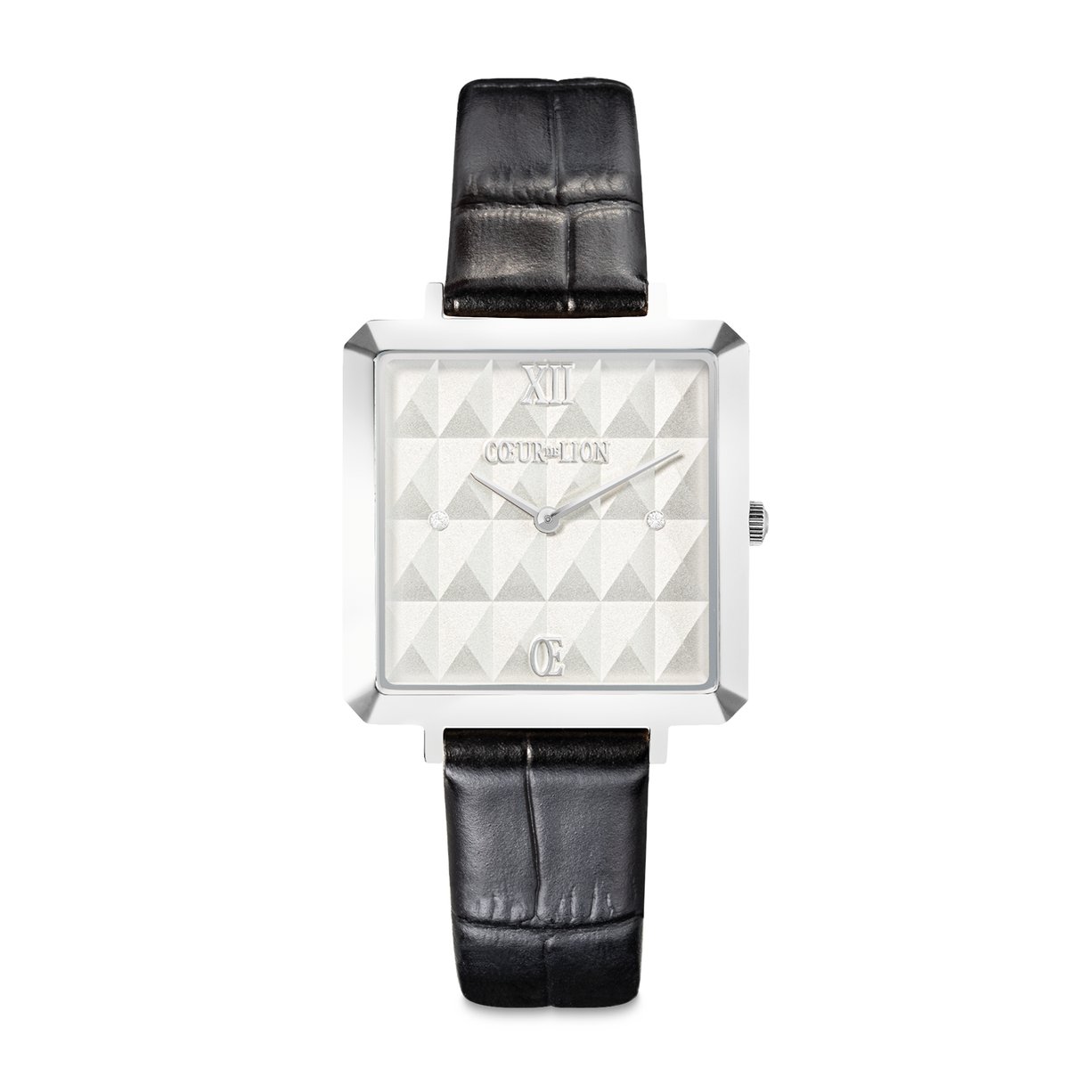 Discover the popular ICONIC CUBE WATCH in a new, exciting spike design that not only displays the time precisely, but also exudes an aura of glamour. The special highlight of this series is the faceted 3D dial. The silver case in combination with the black crocodile-look leather strap gives the watch a casual, elegant look. Matching jewellery from the Spikes series. The watch has a high-quality 316L stainless steel case — 32 x 32 mm and a case height of only 7.5 — 7.8 mm, a first-class Japanese quartz movement with 1.55 V battery (running time 3 years).