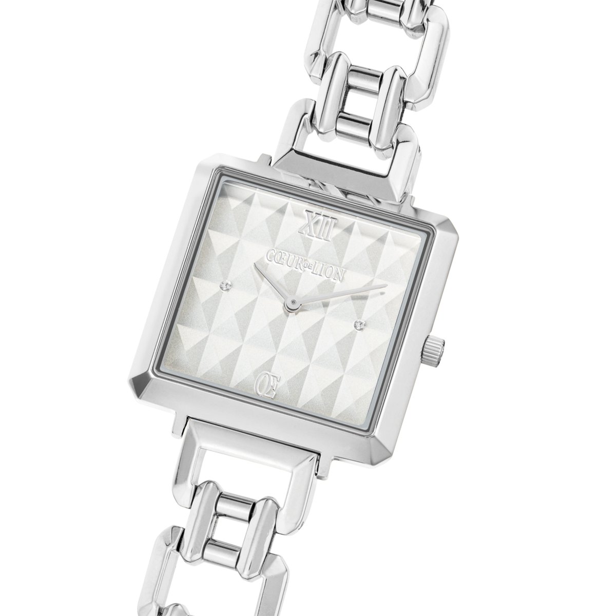 Discover the popular ICONIC CUBE WATCH in a new, exciting spike design that not only displays the time precisely, but also exudes an aura of glamour. The special highlight of this series is the faceted 3D dial. The silver case in combination with the elegant link bracelet, which incorporates the modern facets of the watch case and emphasises the attention to detail and high-quality workmanship of the watch, lends the watch a simple elegance. Matching jewellery from the Spikes series. The watch has a high-quality 316L stainless steel case — 32 x 32 mm and a case height of only 7.5 — 7.8 mm, a first-class Japanese quartz movement with 1.55 V battery (running time 3 years). Easily adjustable stainless steel straps with faceted metal links, strap can be changed in no time at all thanks to the click mechanism. With extra clasp links for easy length adjustment.