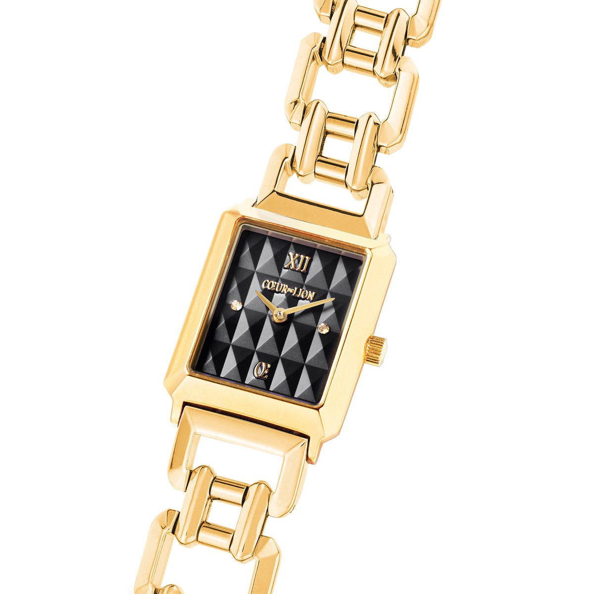 Iconic Spikes Black Statement Gold watch — striking elegance for self-confident womenThis watch is a statement for anyone who loves powerful elegance. The deep black, geometrically structured dial with sparkling zirconia is both modern and luxurious, while the shiny gold stainless steel bracelet with its striking links creates an expressive silhouette. An accessory that goes perfectly with festive outfits but also adds glamour to everyday wear — ideal for women who want to show their sense of style with every detail.Technical details: 316L stainless steel case, dimensions 22 x 27 mm, diameter 3.2 cm, height 0.7 cm, mineral glass, Japanese quartz movement, water-resistant to 5 ATM. Length 18.5 cm, adjustable from 14 to 18.5 cm, stainless steel bracelet with secure folding clasp.