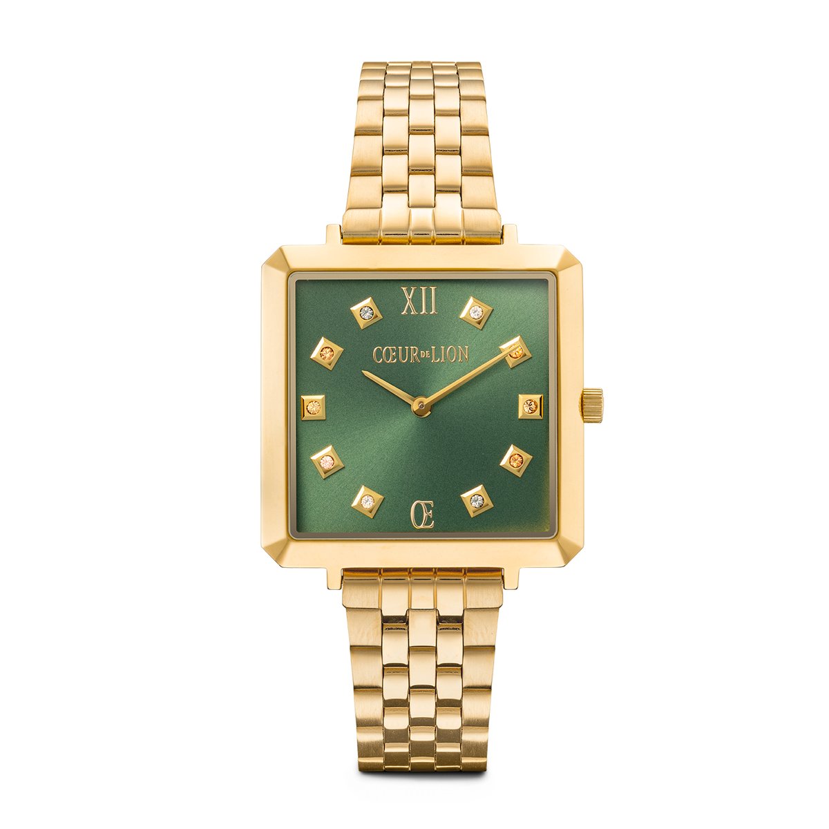 ICONIC CUBE WATCH IN GLAMOROUS GREEN The Iconic Cube Watch in Glamorous Green has a high-quality casing with faceted edges and a shiny stainless-steel strap. The colour combination of a gold-coloured watch and an olive-green dial, embellished with sparkling tone-on-tone pavé-set crystals, is particularly elegant. Worn every day or for special occasions, this glamorous watch is bound to turn heads.