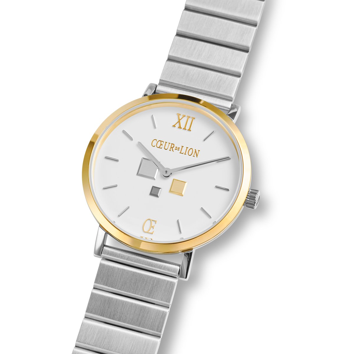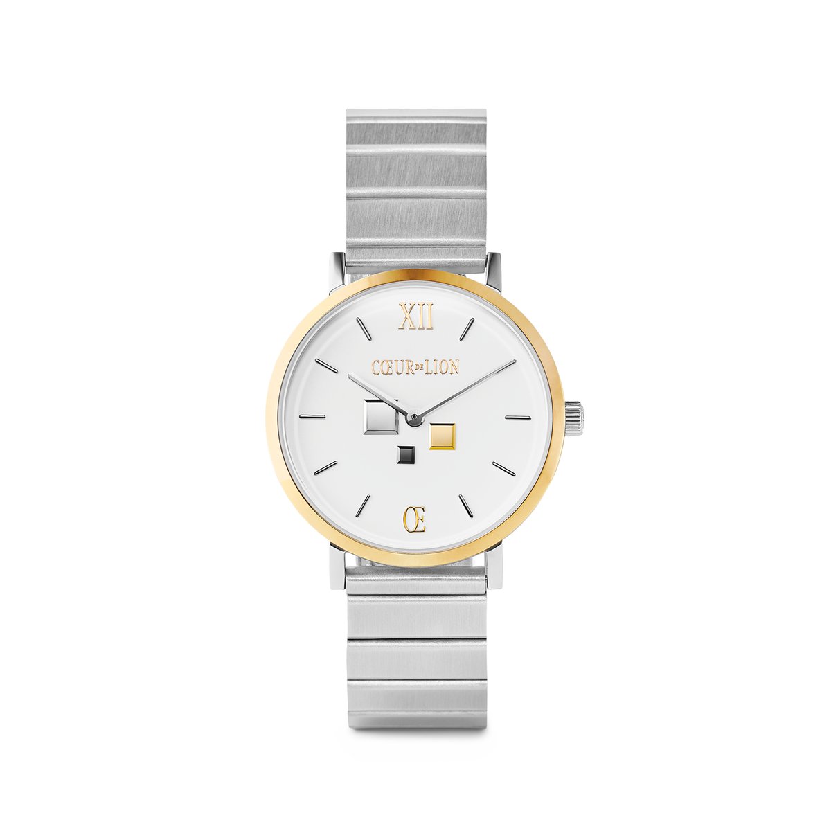 A premium bicoloured casing made of silver stainless steel with a golden bezel combined with a silver-coloured strap made from satin-finish metal links and a matt-white dial. This timelessly beautiful bicolour watch is an ideal complement to silver and gold jewellery and adds a sophisticated touch with fine metal applications in silver, gold and anthracite. To wear individually or in combination — this model is always worth a look.