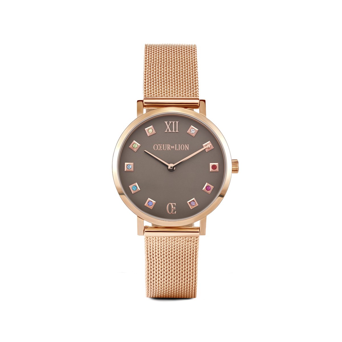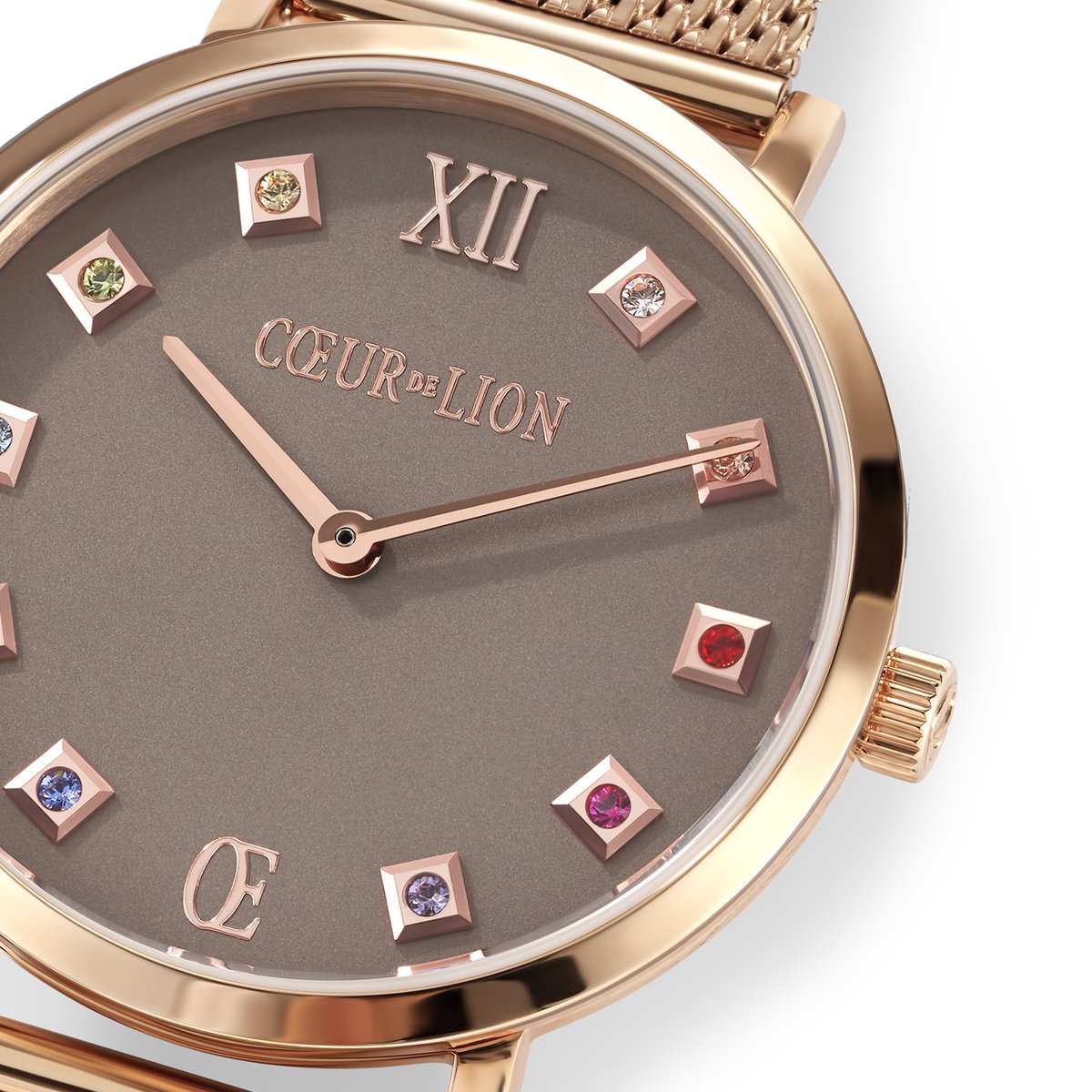 For female conquerors. A high-quality casing and Milanese strap made from rose gold stainless steel are complemented by a sandblasted-effect dial in stunning Mocha, finished with sparkling Swarovski® crystals for a burst of colour. Worn alone or in combination with jewellery from COEUR DE LION, this elegant watch is sure to make a majestic impression.